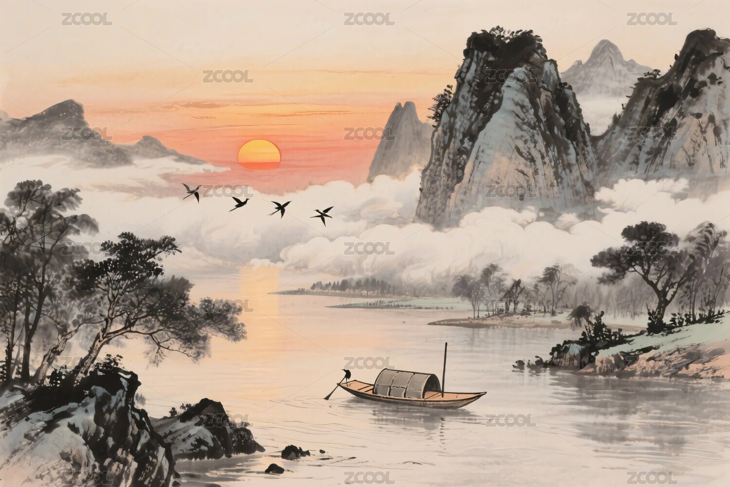 山水,霞光,飞鸟,水面,倒影,山脉,水鸟,云雾,太阳,水墨