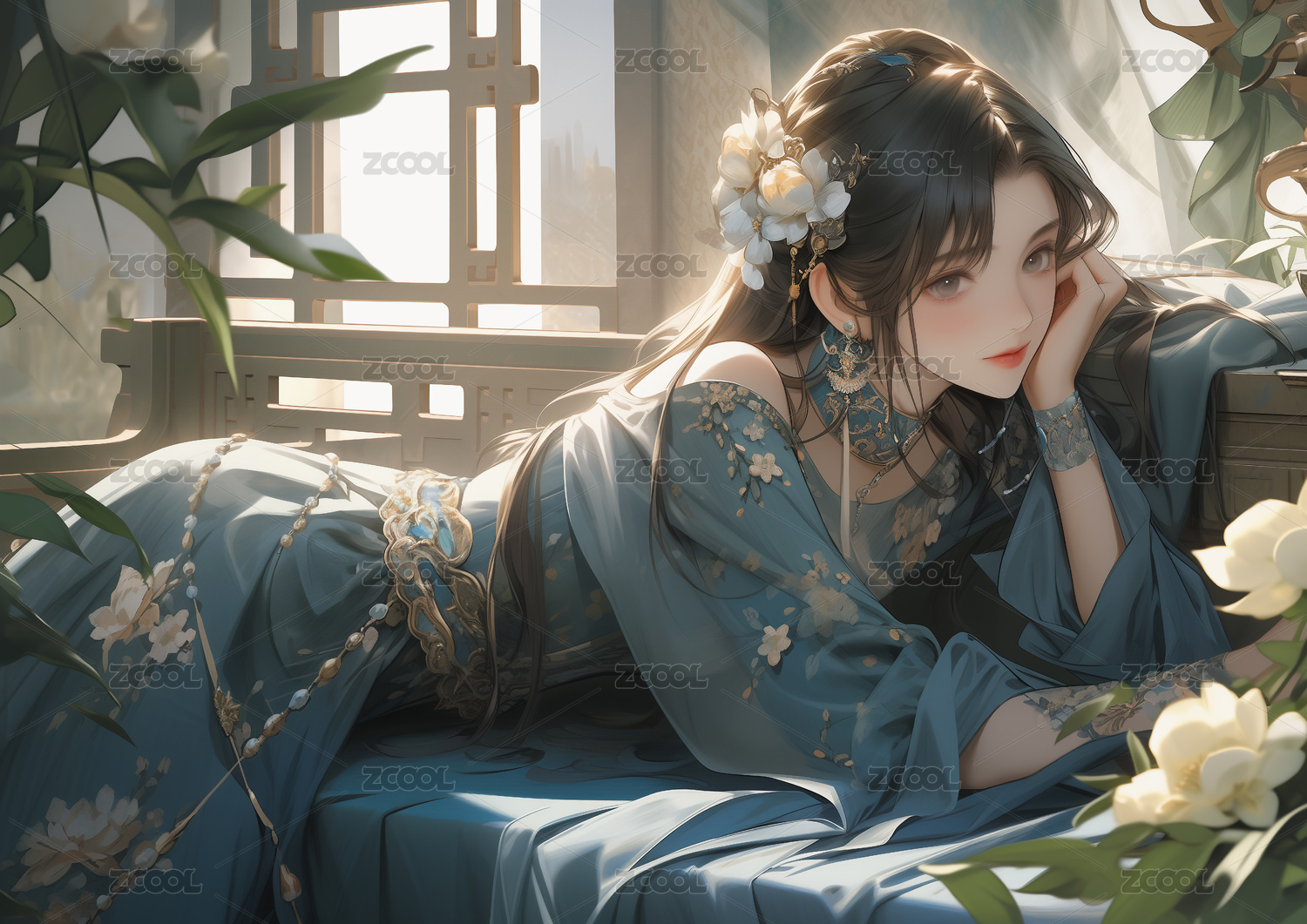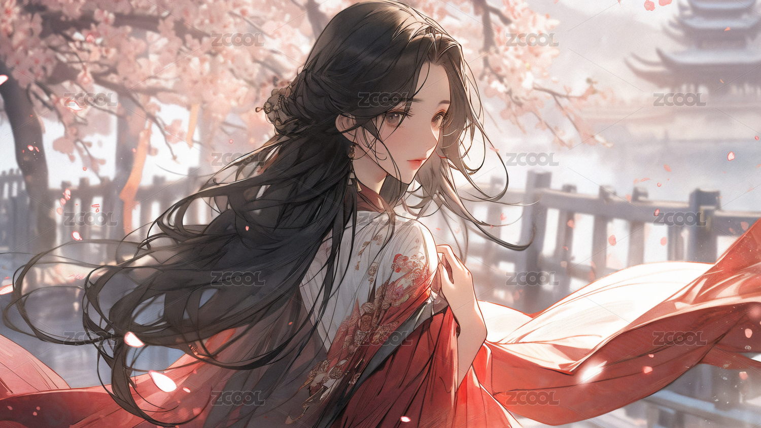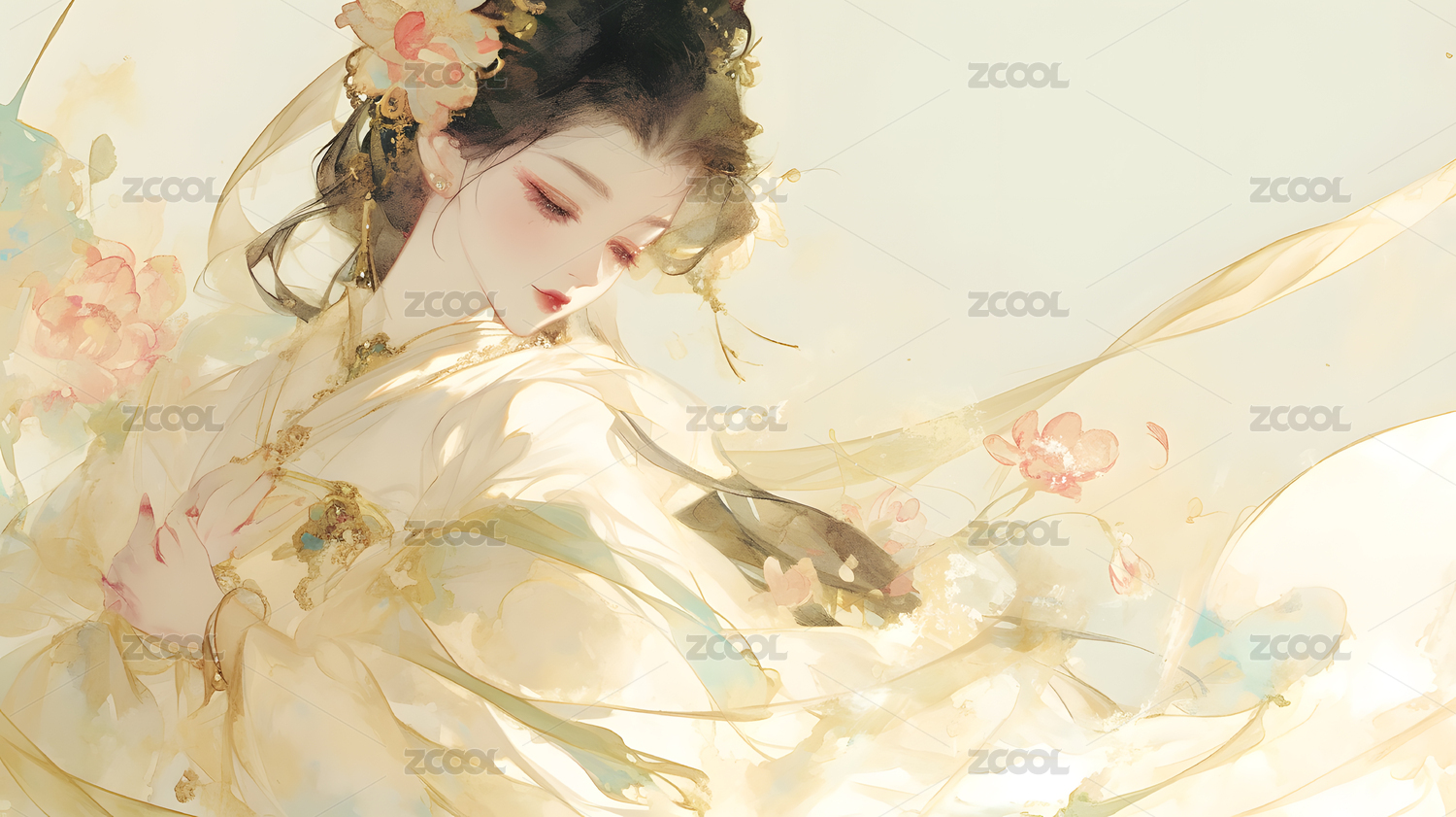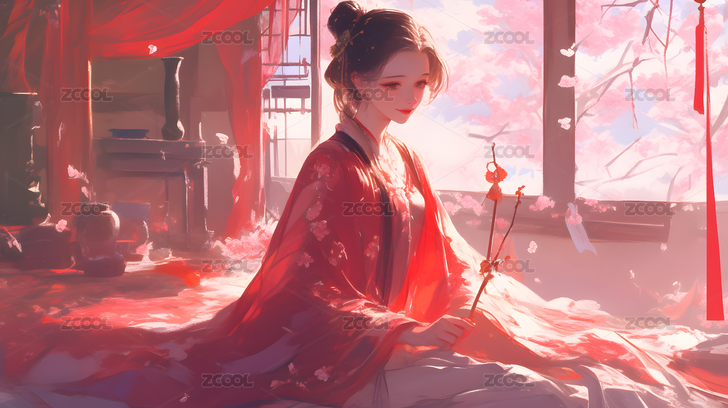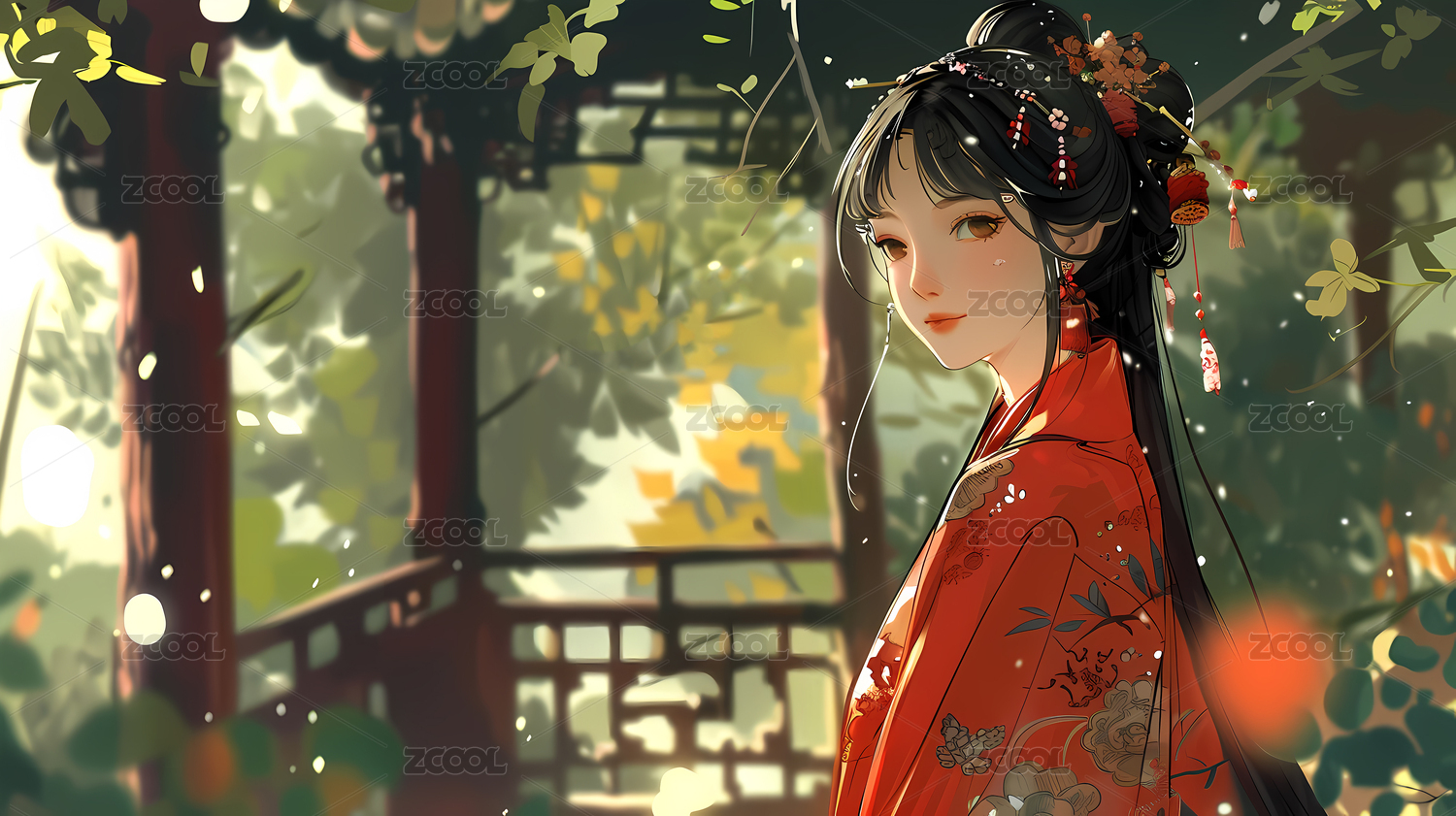 手绘卡通古风身穿传统服饰汉服漂亮女孩插画