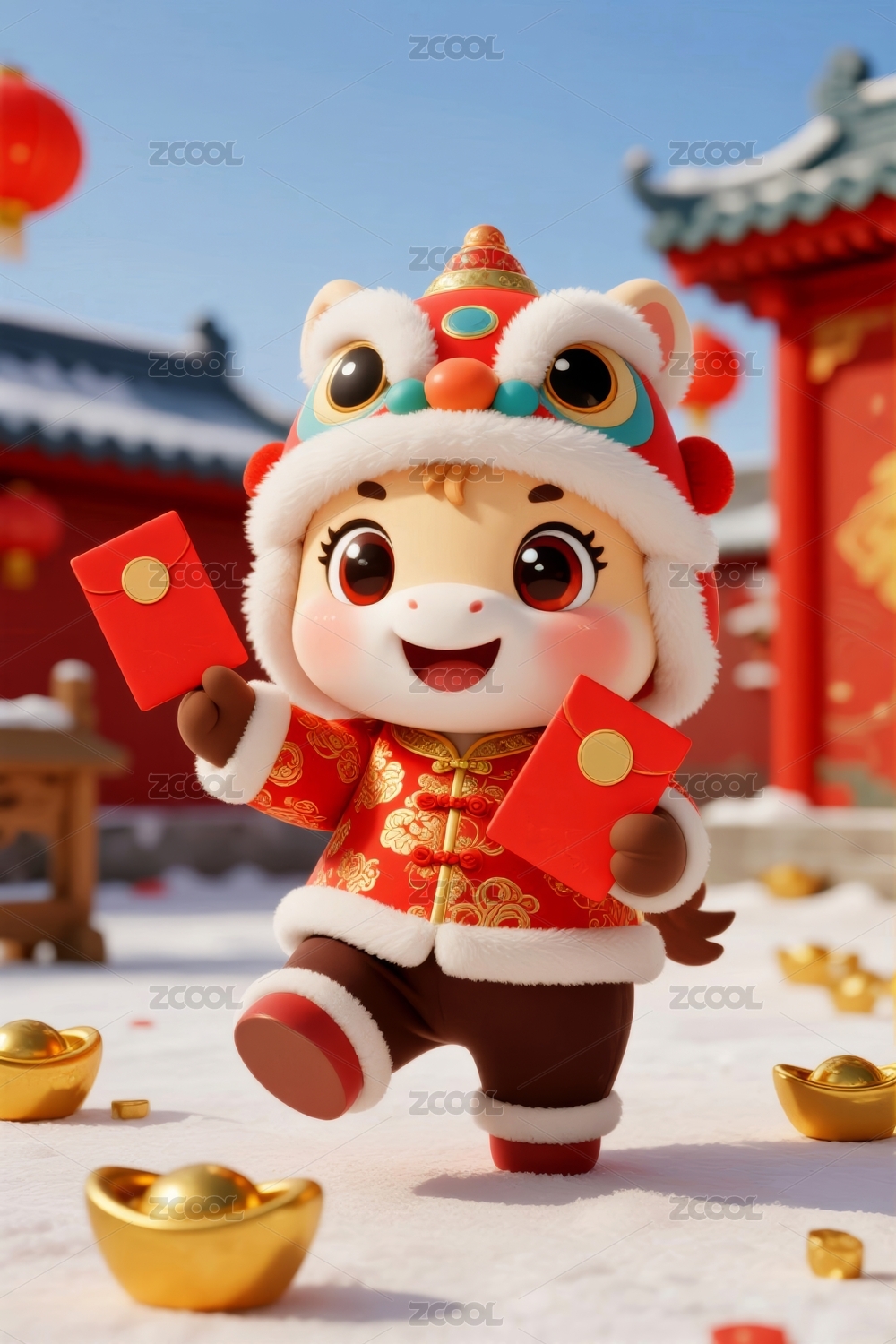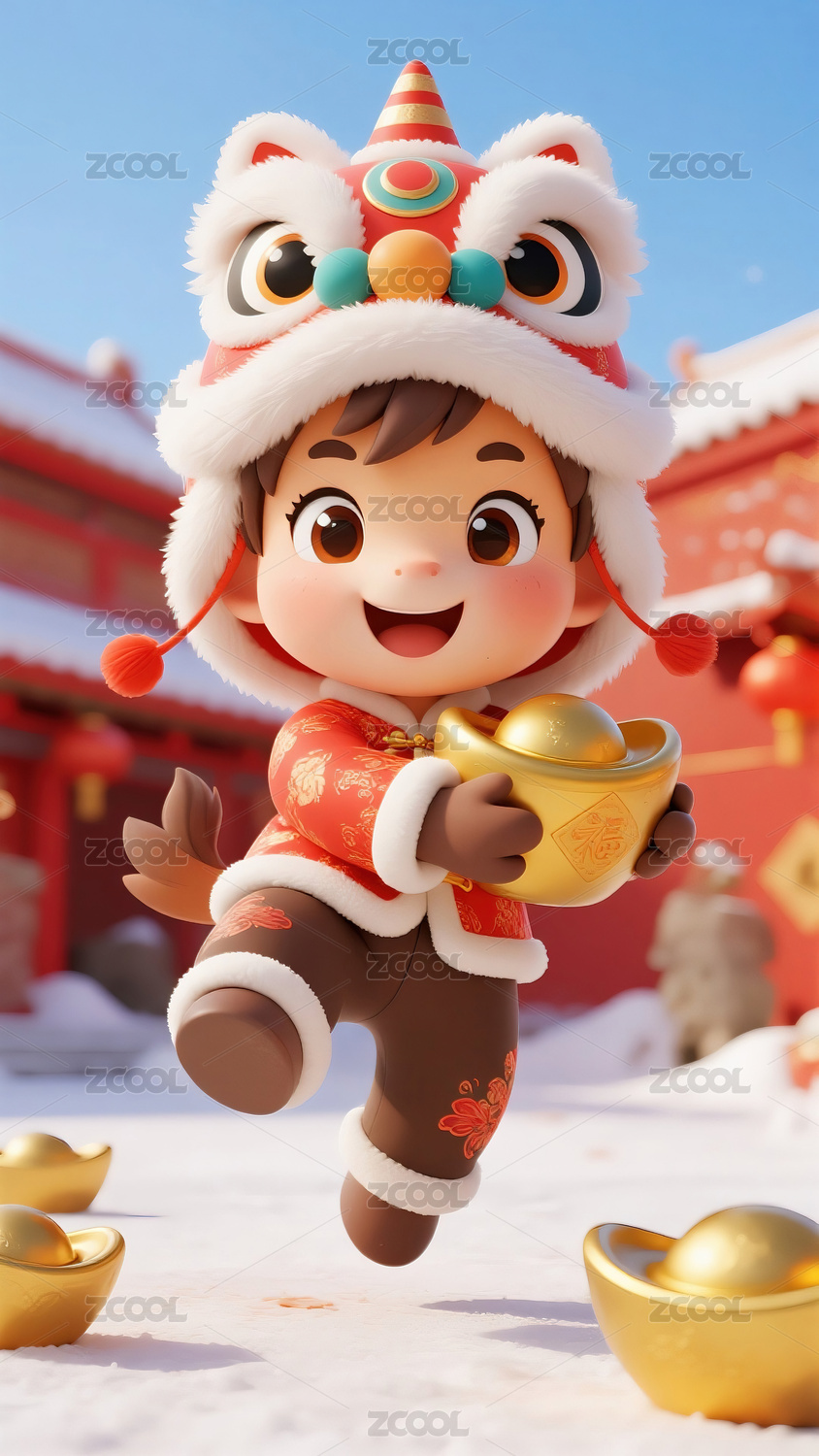 中国新年春节街上头戴狮头帽子的3D男孩