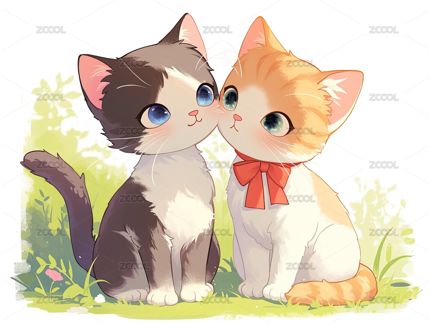 可爱,动物,卡通,水彩,树枝,户外,Q版,毛绒,草地,猫