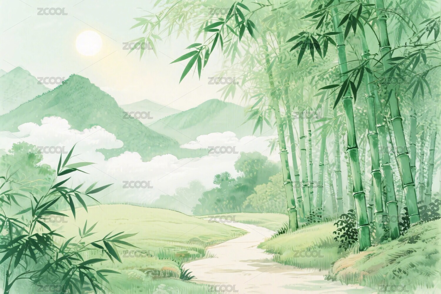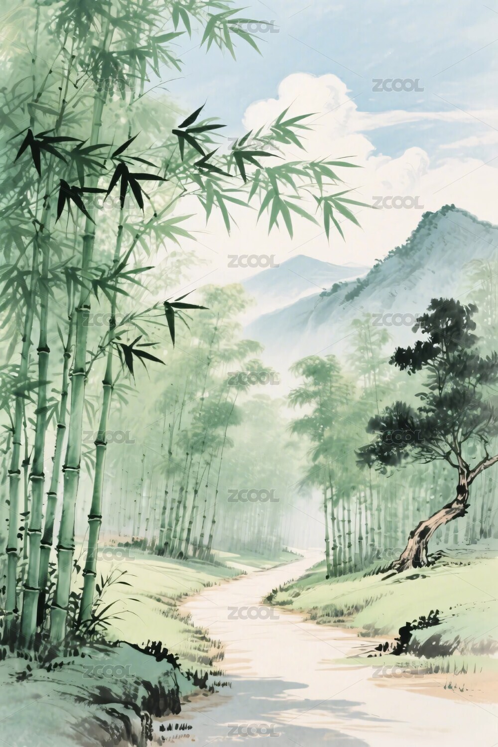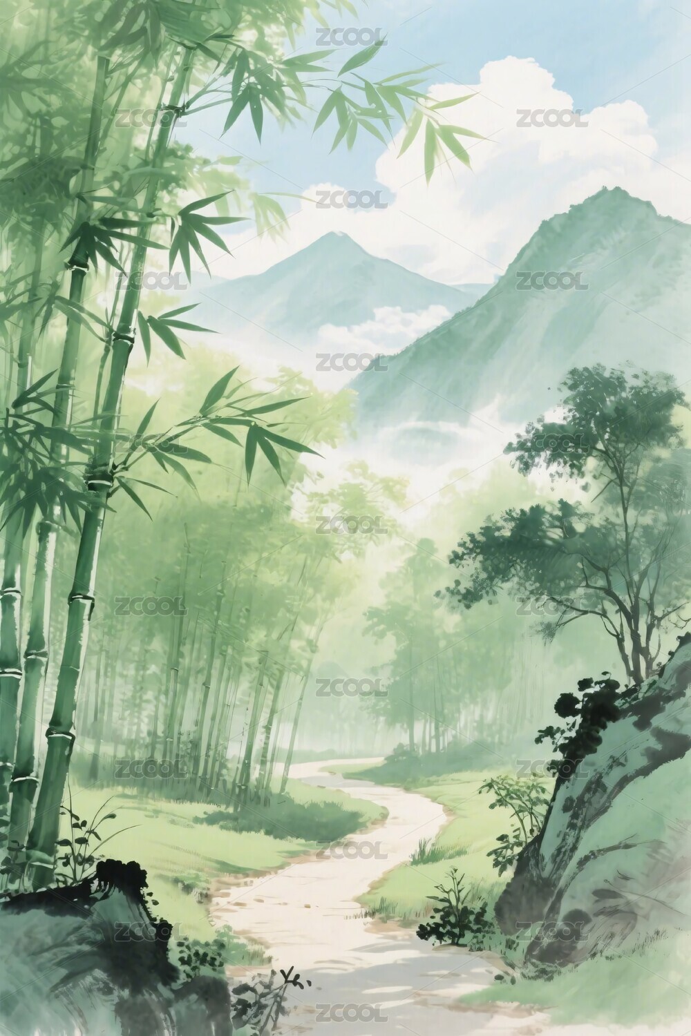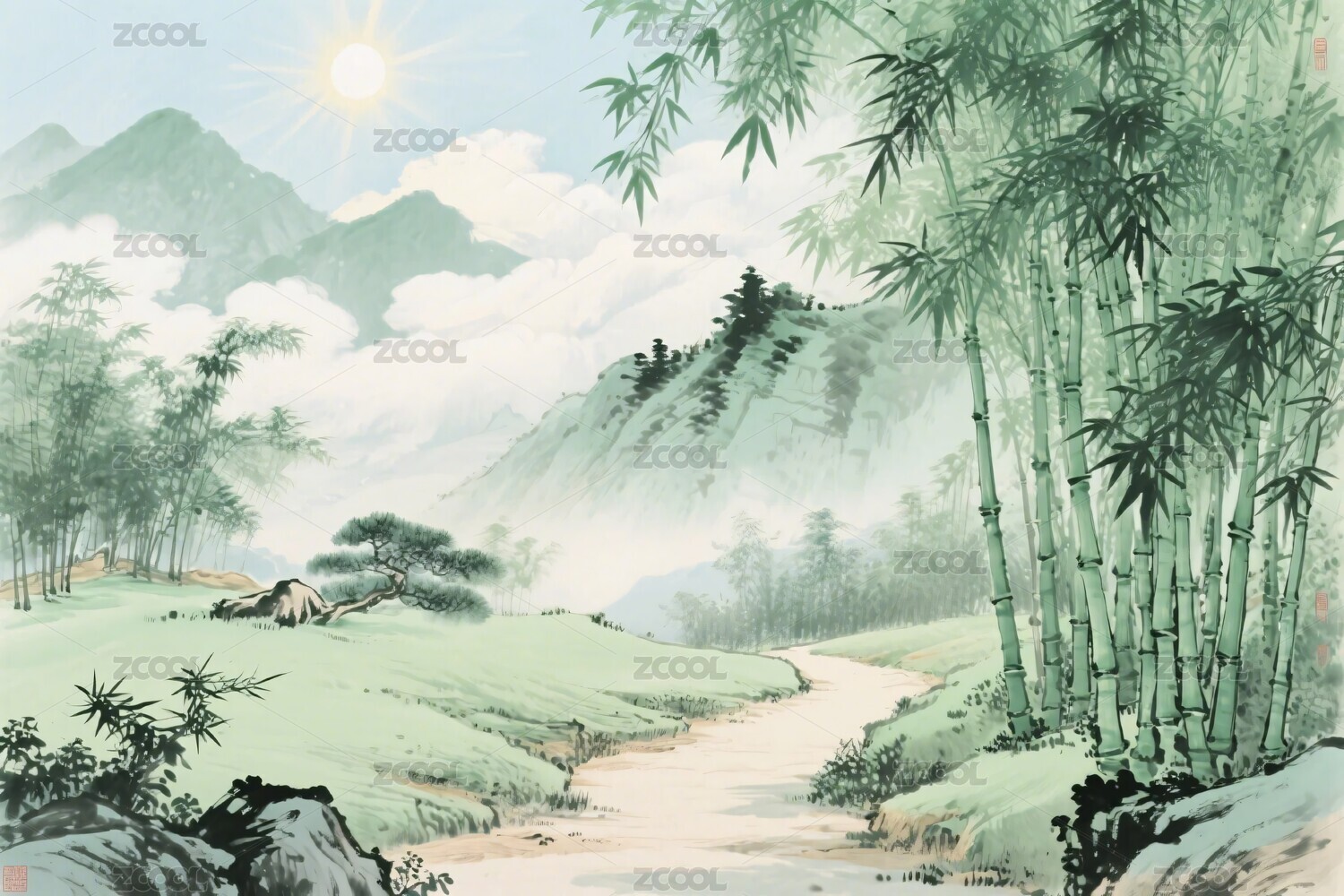 竹林,山水,小路,山峦,阳光,水墨,国画,风景,画卷,山水画