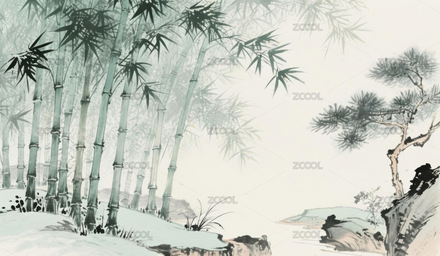 墨竹山水中式绘画场景