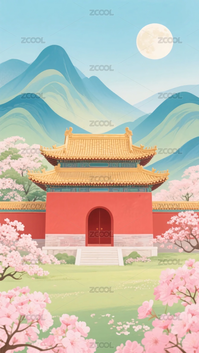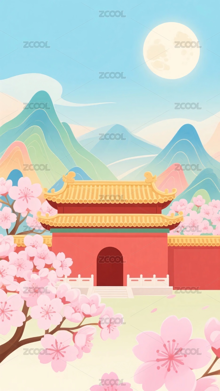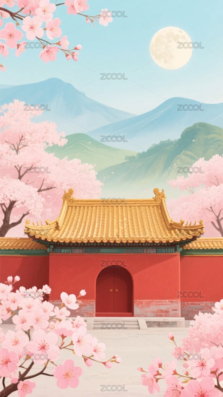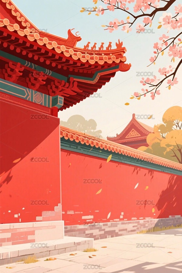 古建筑,古风,插画,红色墙,传统建筑,宫廷,屋顶,樱花,古墙,传统风格