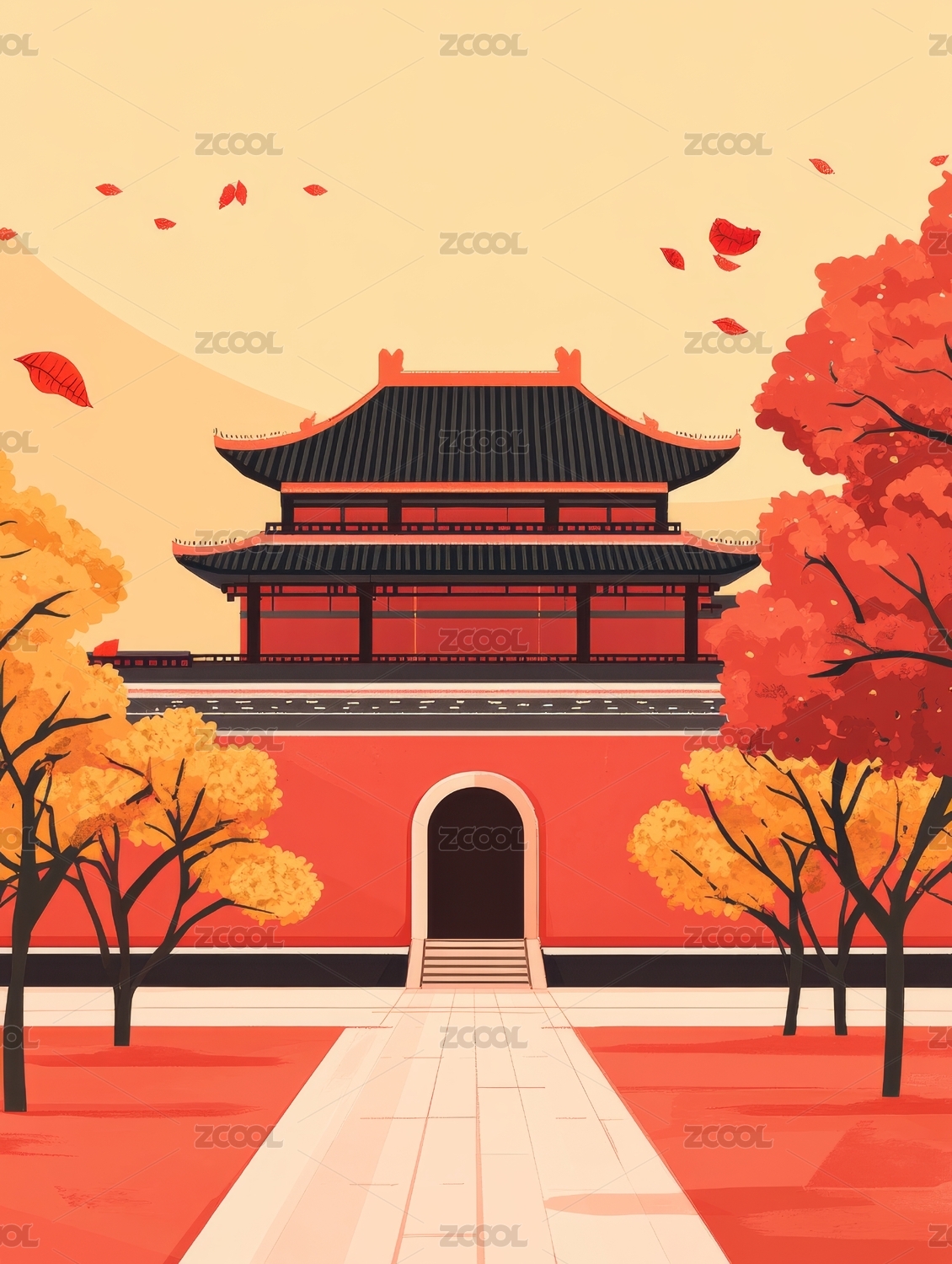 古风,庭院,古建筑,屋顶,红墙,树叶,树木,插画,传统,建筑