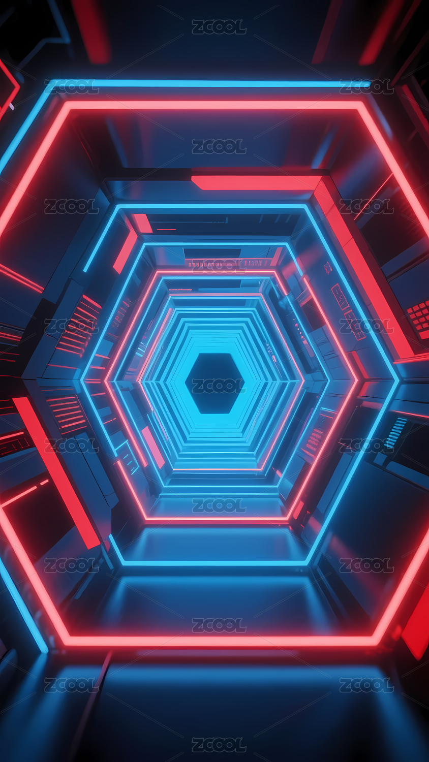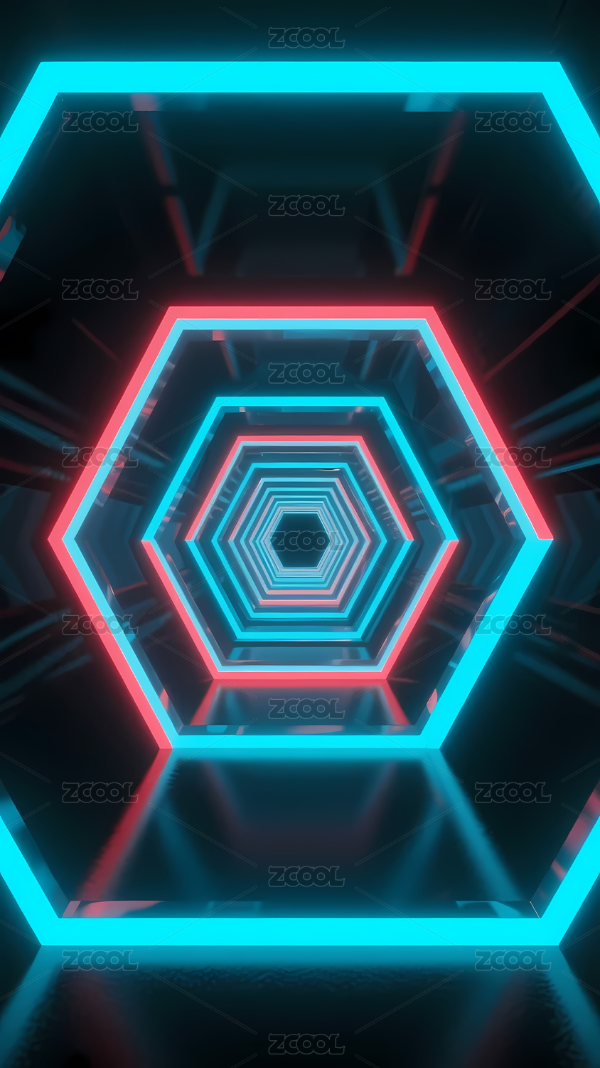 蓝色,科技,未来,深色,对比,红色,霓虹灯,隧道,六边形,框架
