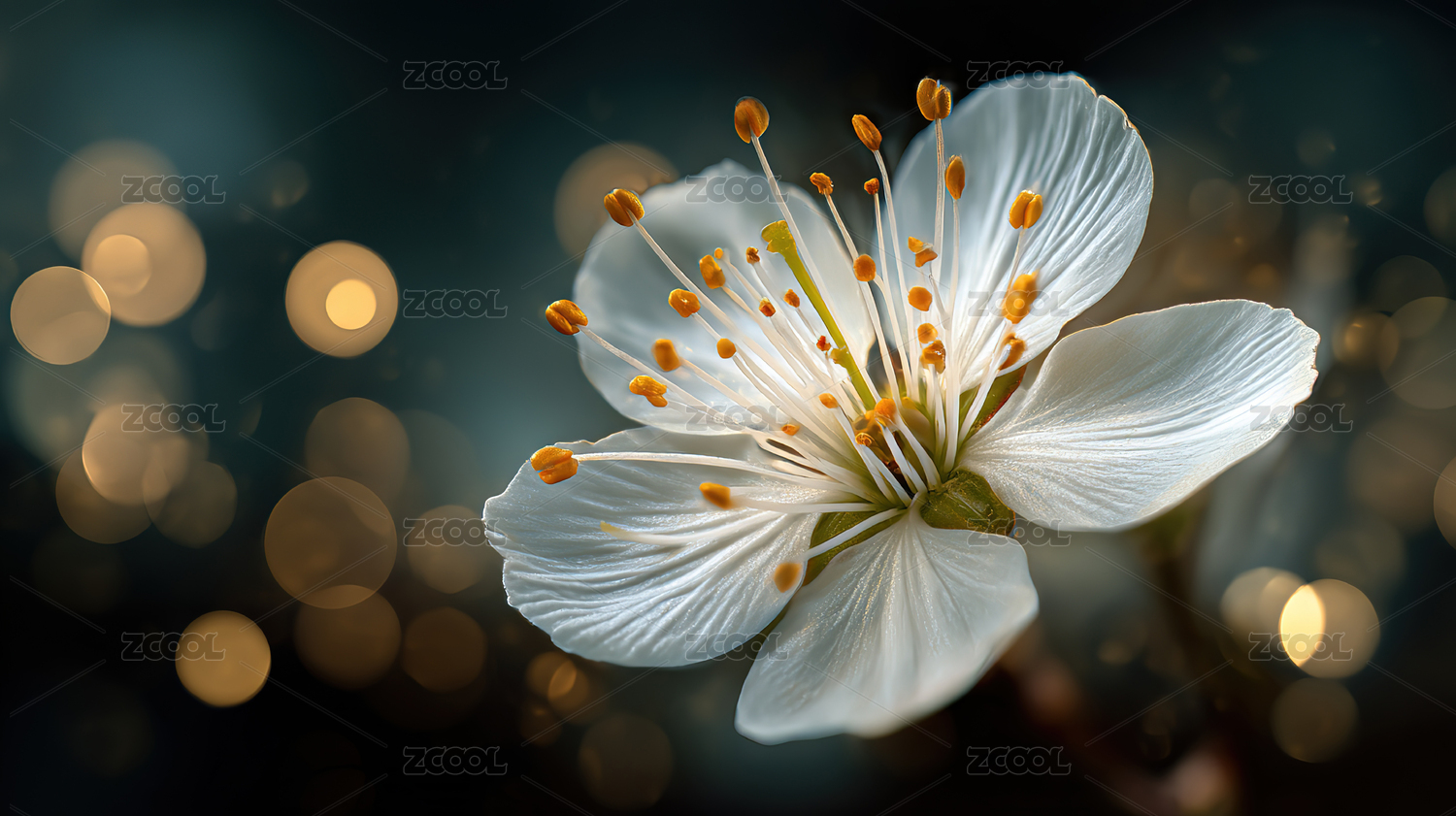 微距镜头下的白色花朵与金色光斑