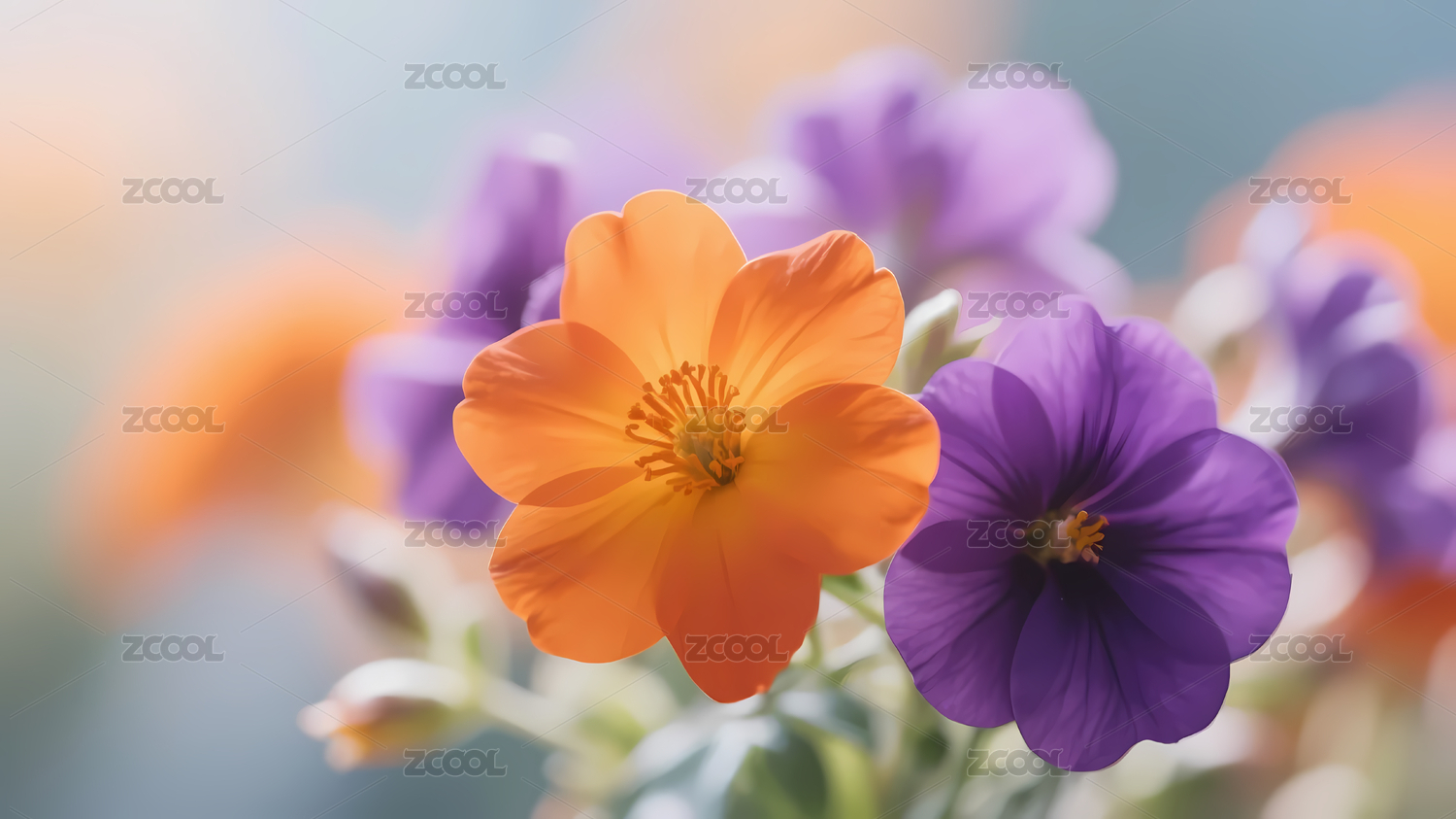 橙色花朵柔和蓝色调