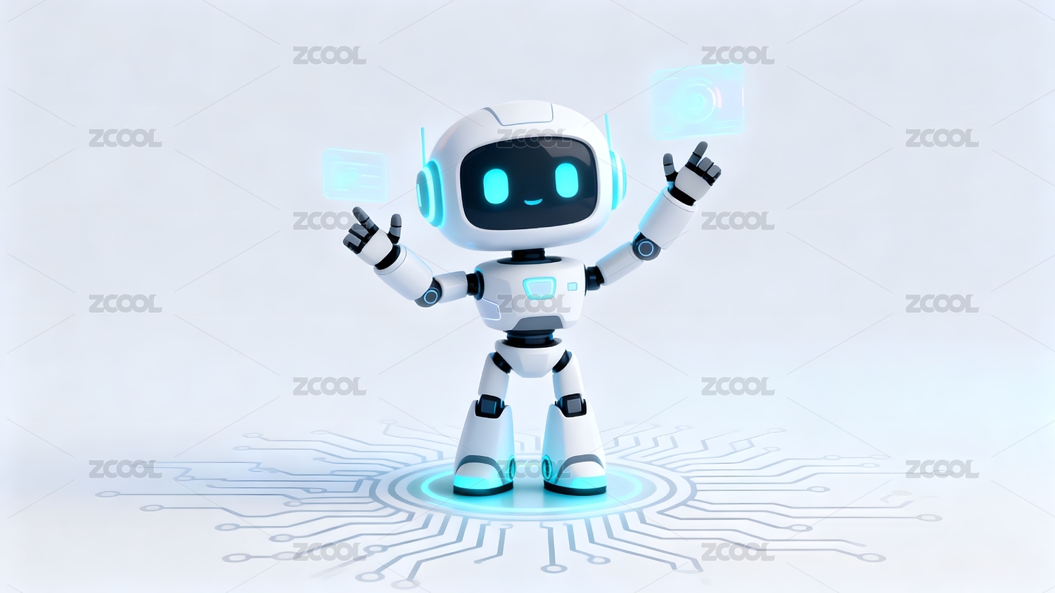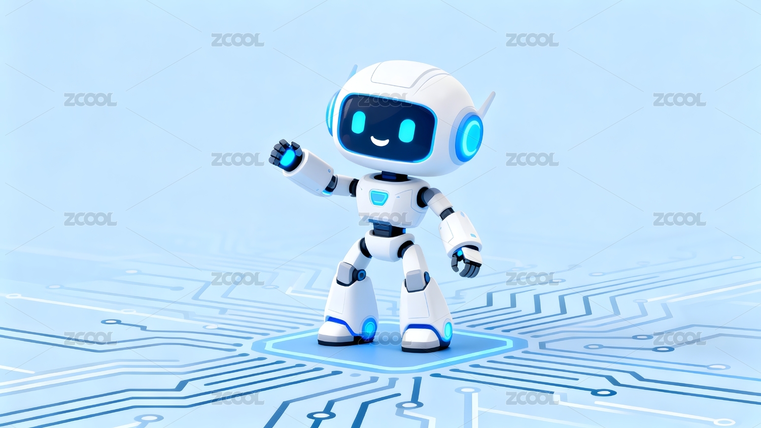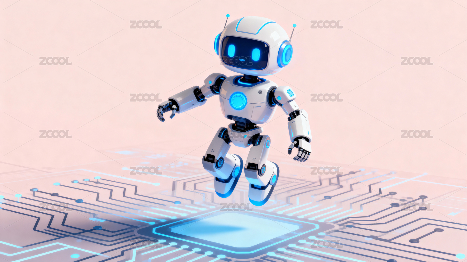 白色机器人张开双臂站立发光电路板上