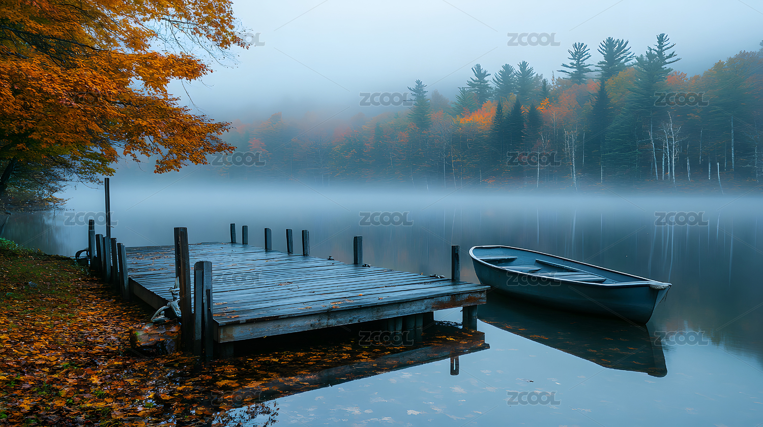秋雾湖畔落叶静景