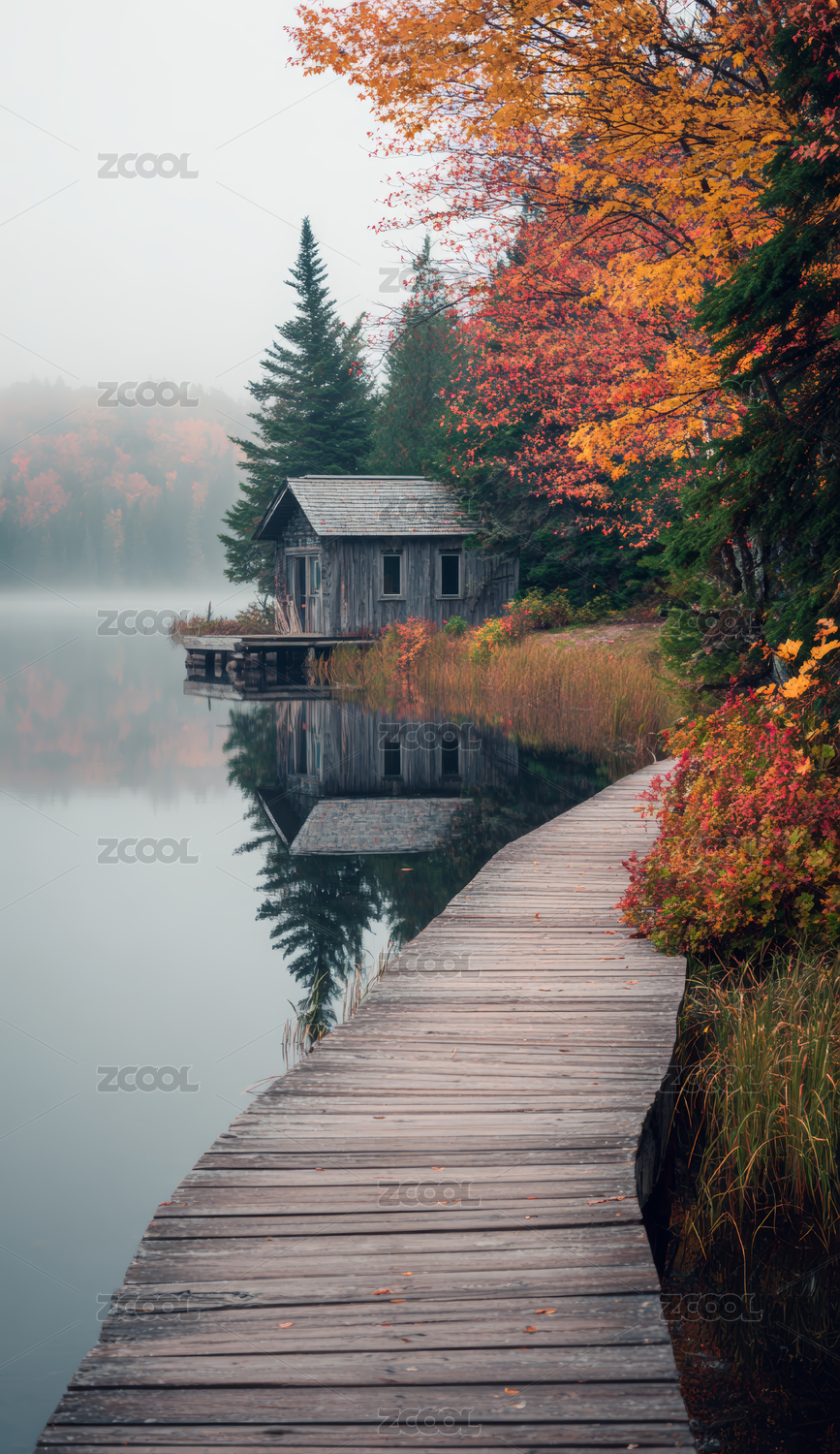 秋日雾湖与红叶