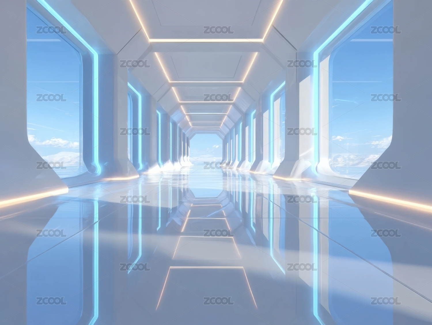 明亮,简洁,光影,科技,白色,反射,未来,走廊,拱形,空旷
