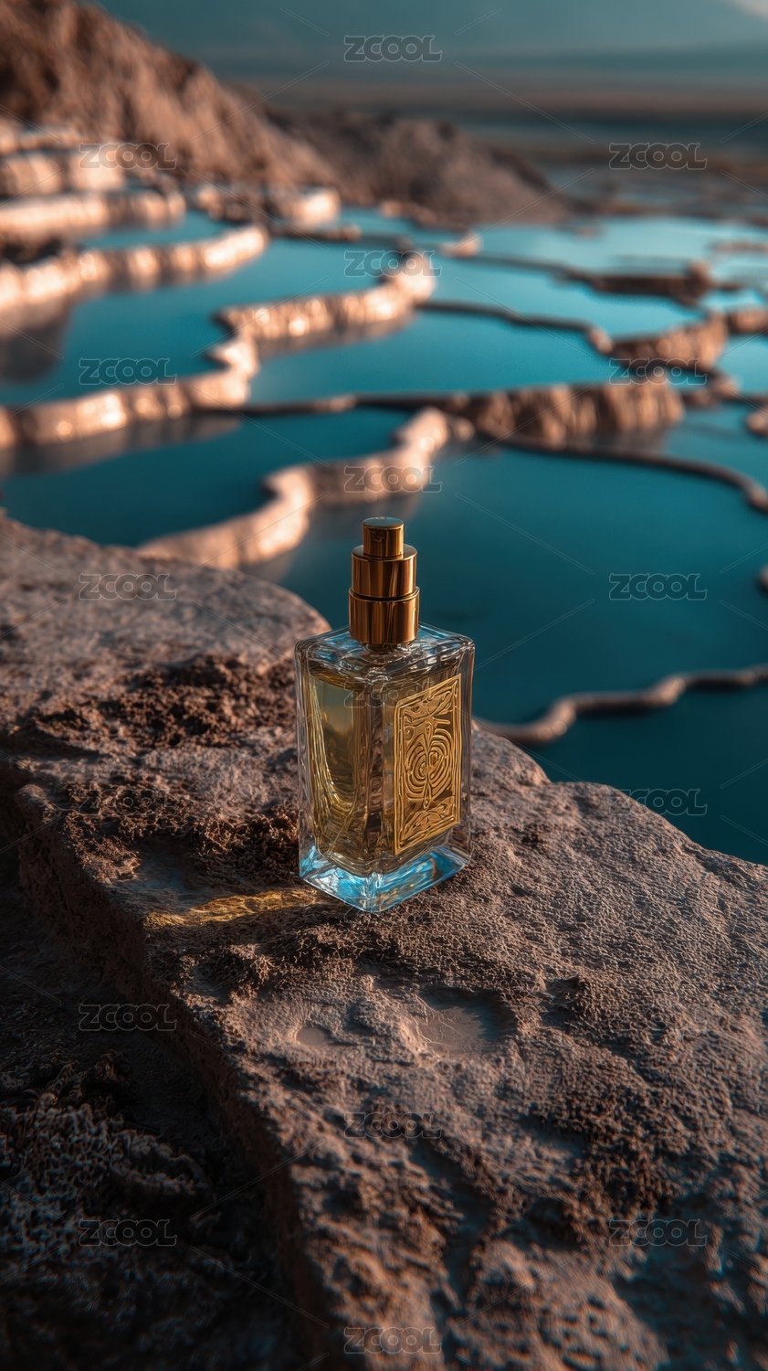 香水瓶置于岩石之上背景为盐湖