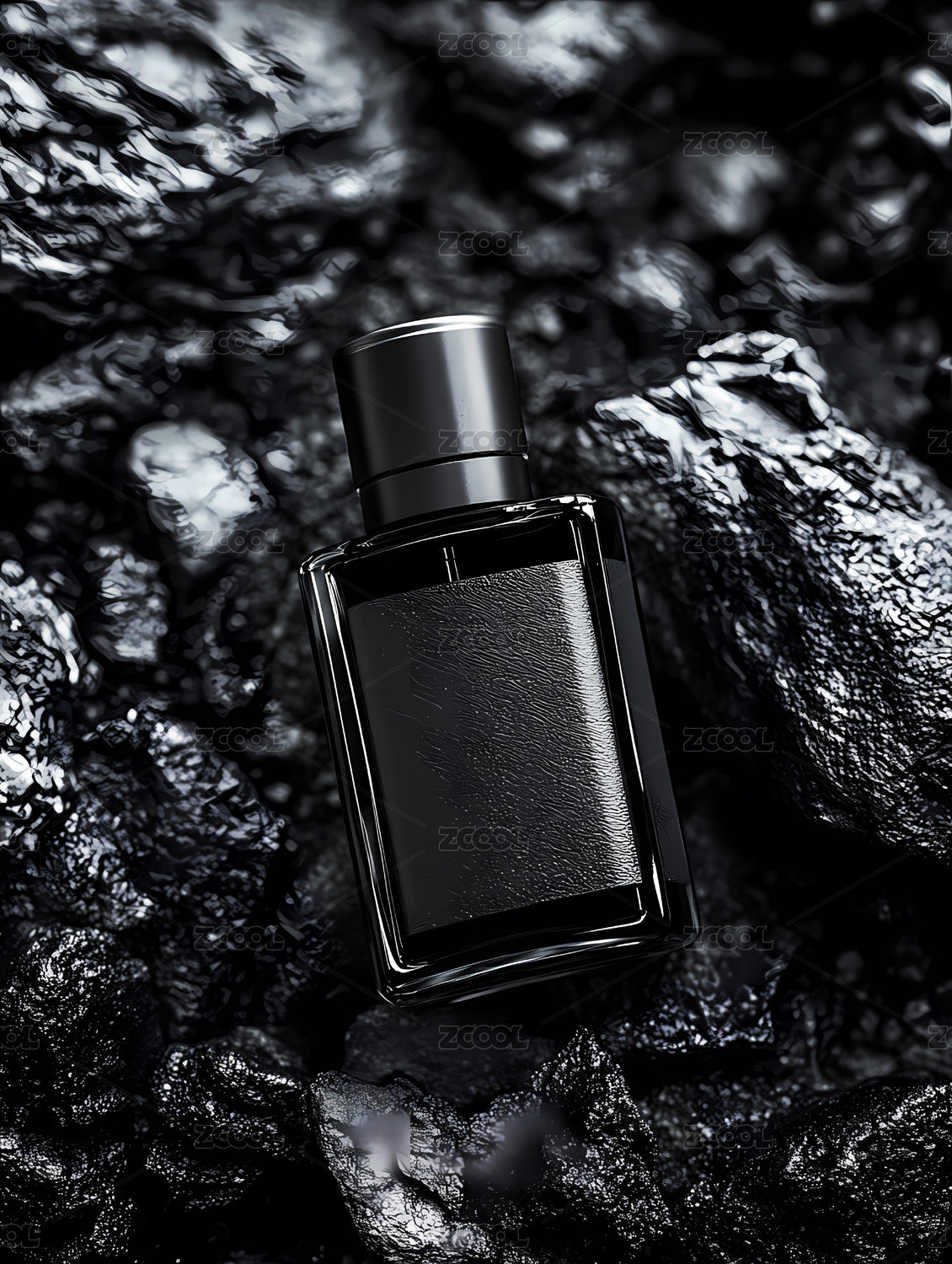 黑色香水瓶置于岩石表面