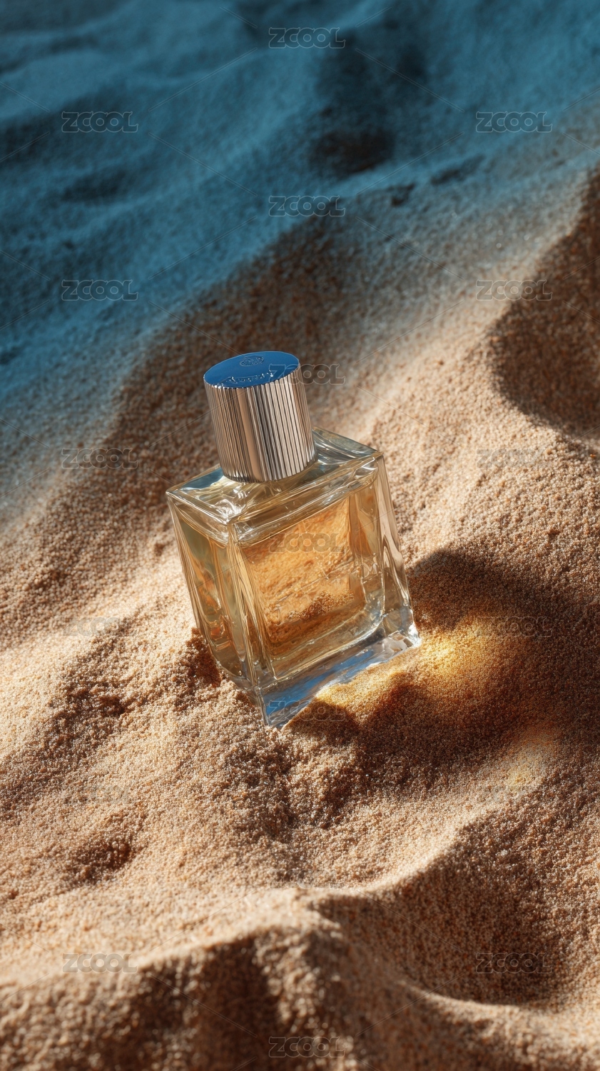 香水瓶置于细腻沙滩之上