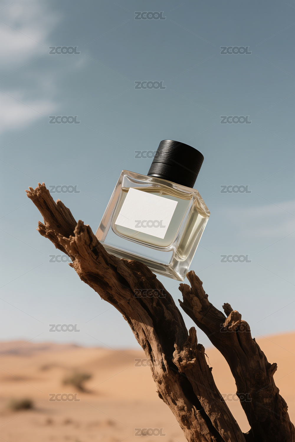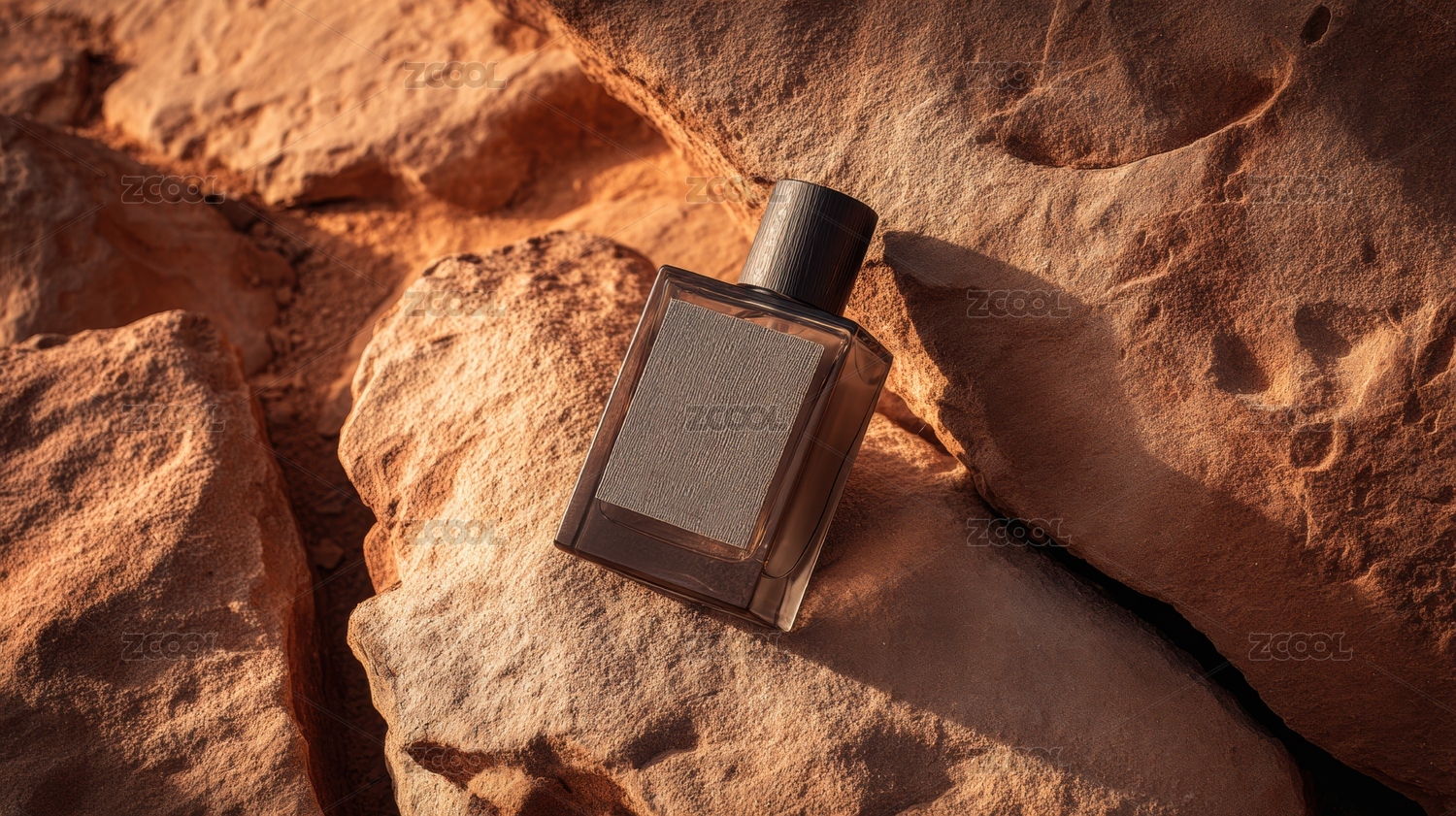 香水瓶置于沙漠岩石之上