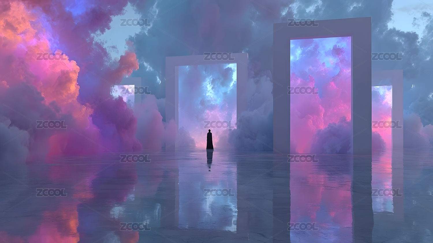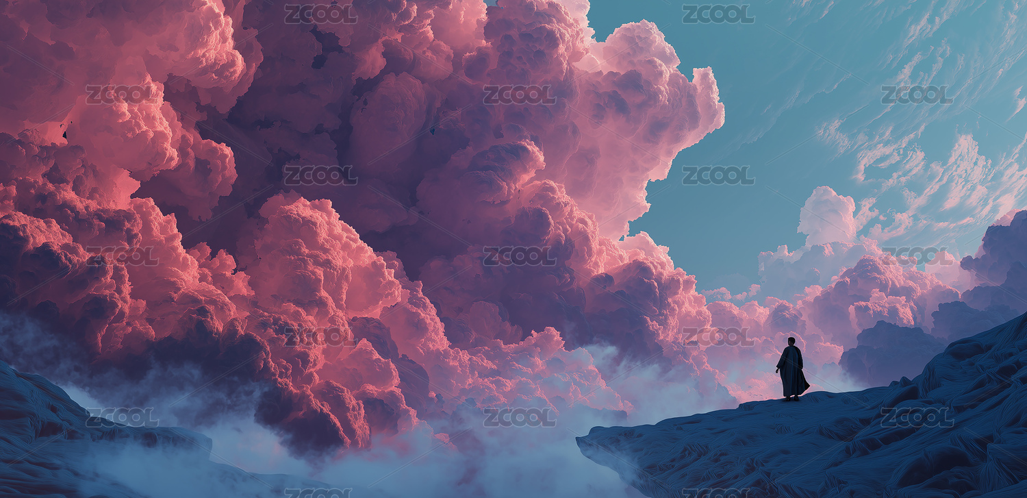 人物立山崖望粉云蓝天构成梦幻空灵自然场景