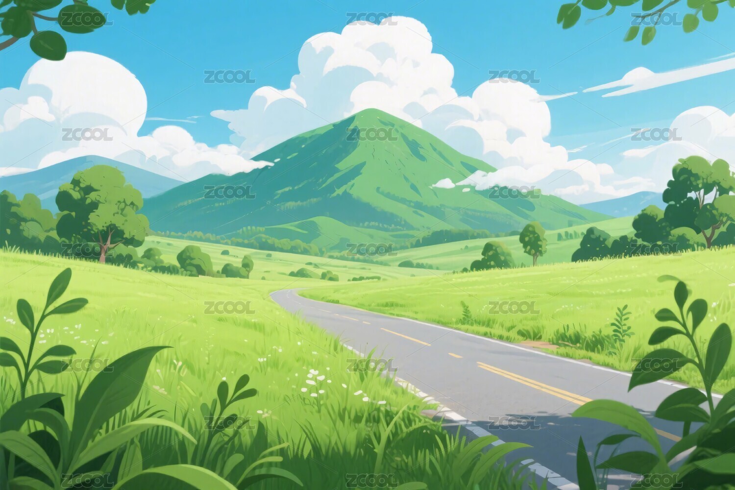 公路,风景,卡通,插画,矢量,自然,草地,花朵,蓝天,云朵