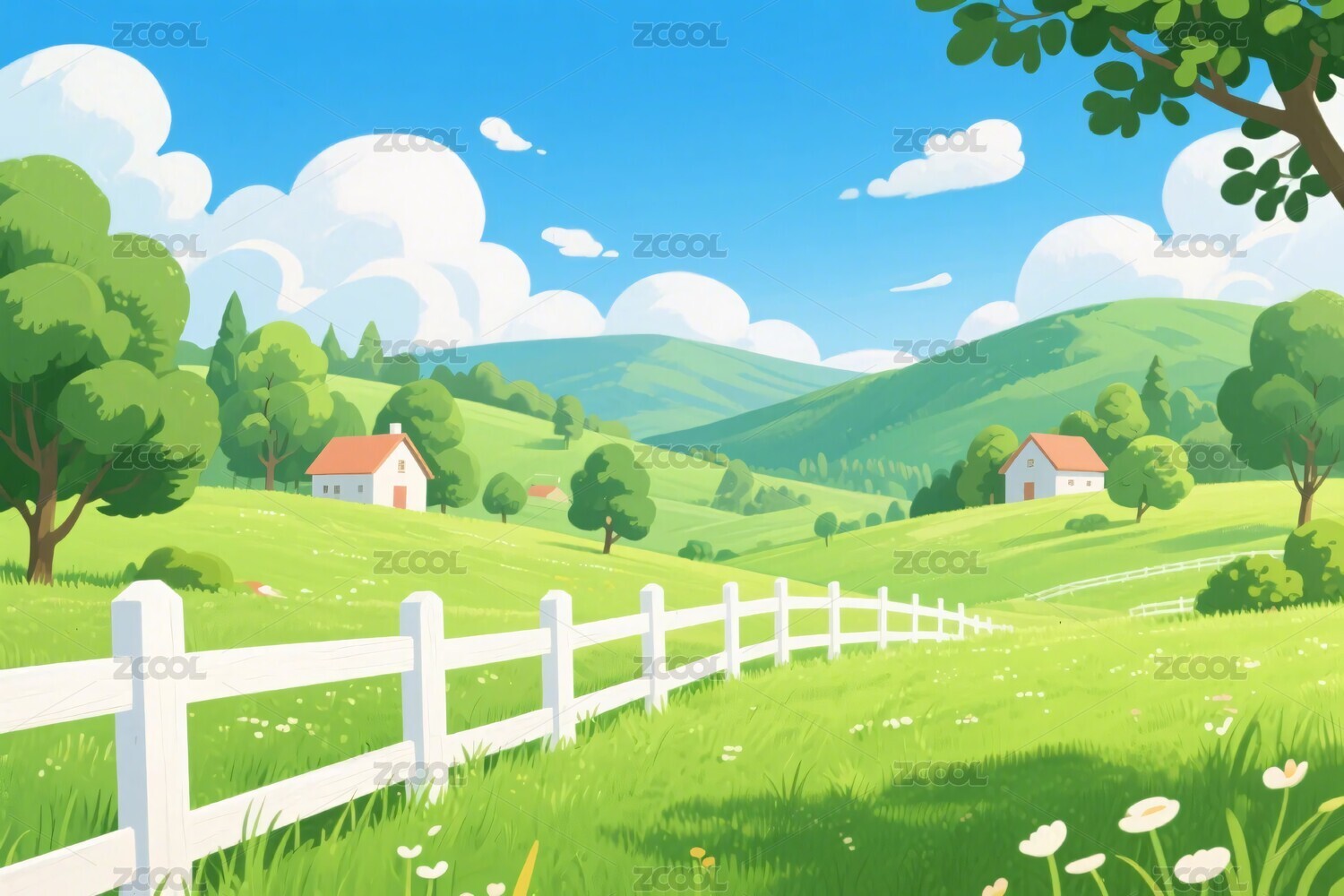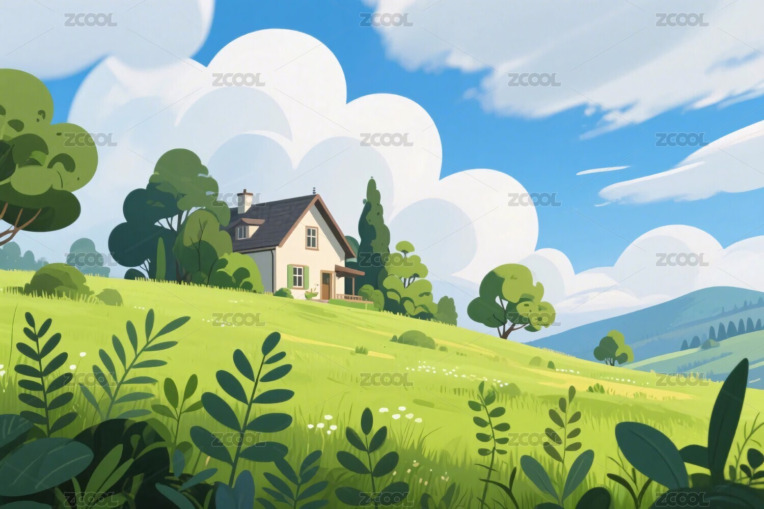 房屋,青山,绿树,草地,小花,蓝天,田园,乡村,风景,插画