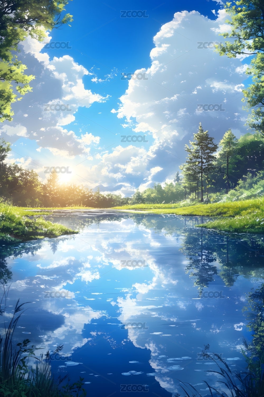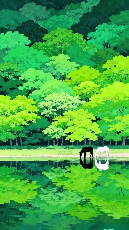 插画,手绘,森林,绿韵,双马,饮水,镜湖,倒影,层林,渐变