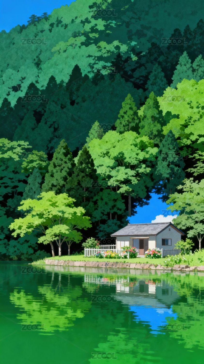 湖畔小屋与绿林倒影