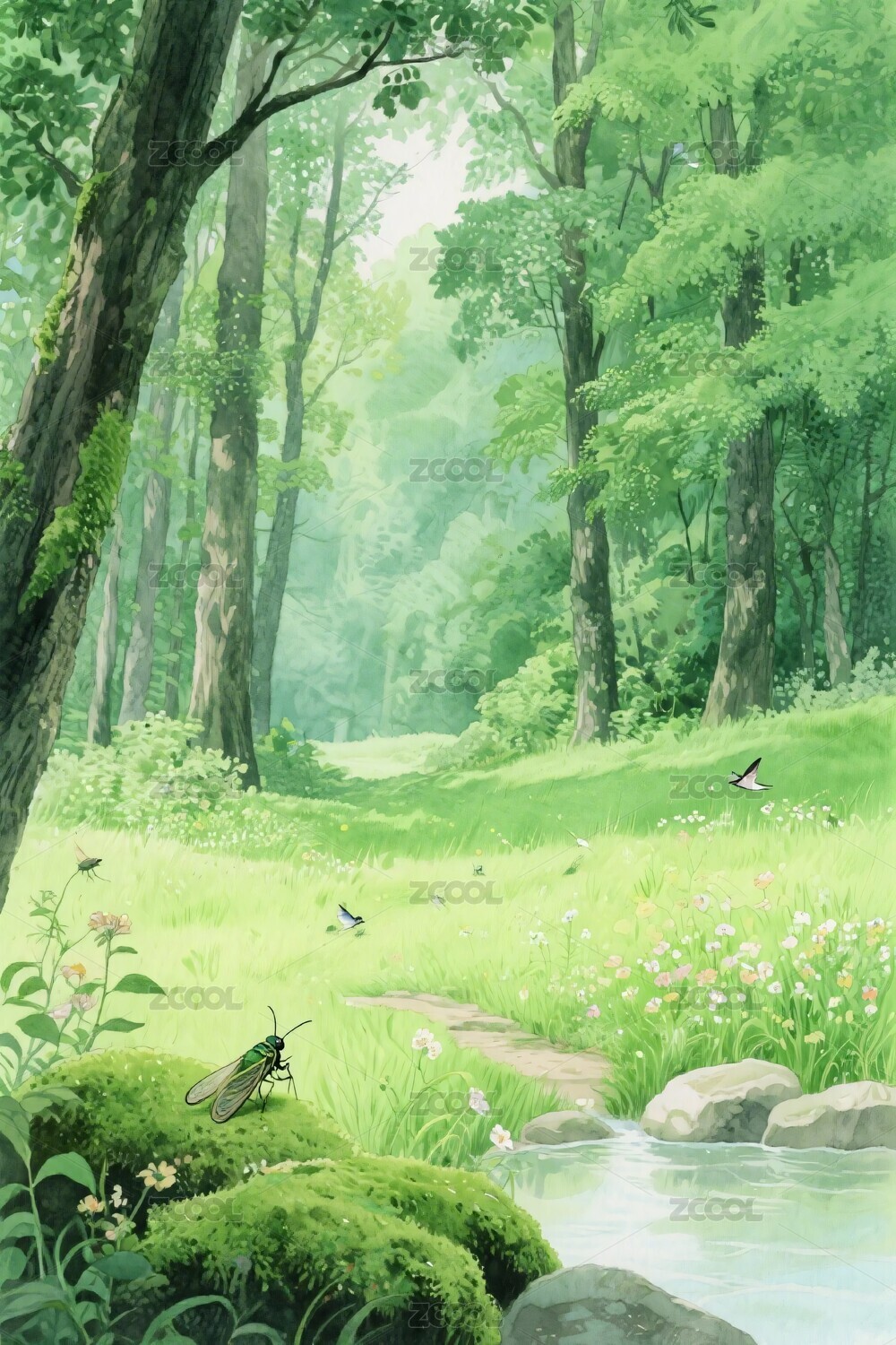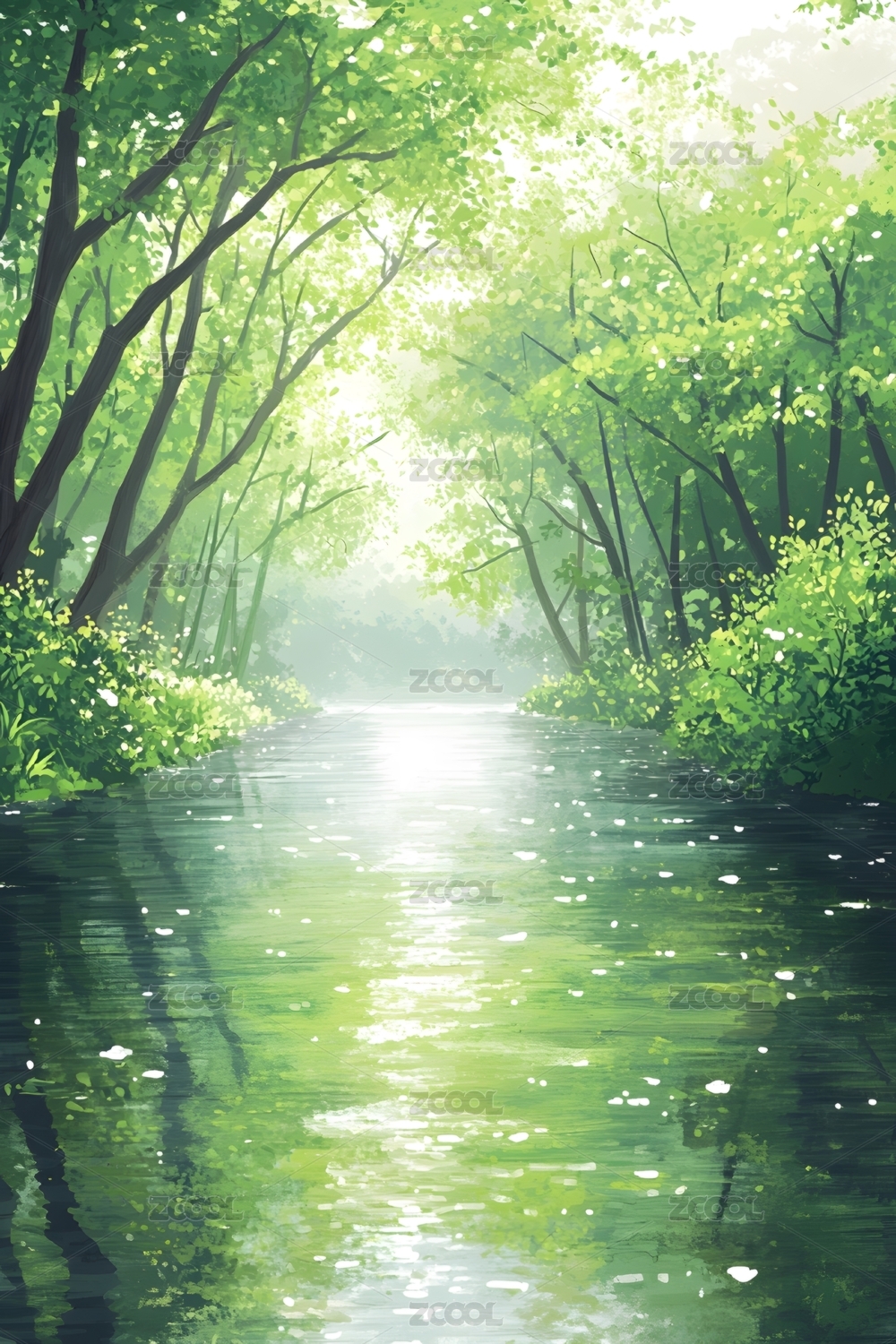 幽静绿色茂密森林中的清澈小溪插画绘画