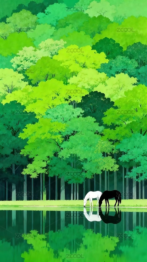 插画,手绘,森林,绿韵,双马,饮水,镜湖,倒影,层林,渐变