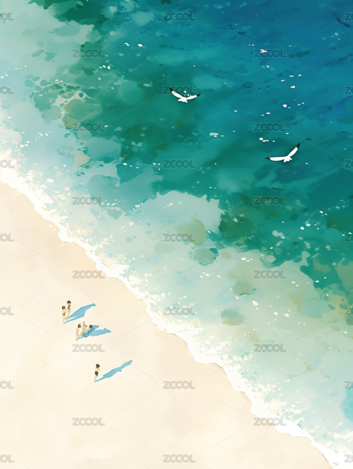 水彩,插画,海洋,海浪,海鸥,沙滩,蓝天,碧波,涟漪,浪花
