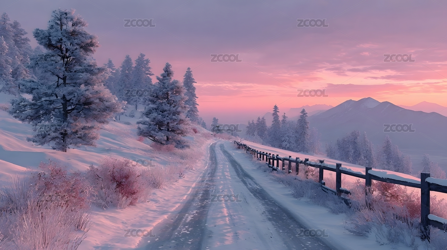 雪景,冬季,道路,树木,天空,雪花,梦幻,风景,插画,矢量