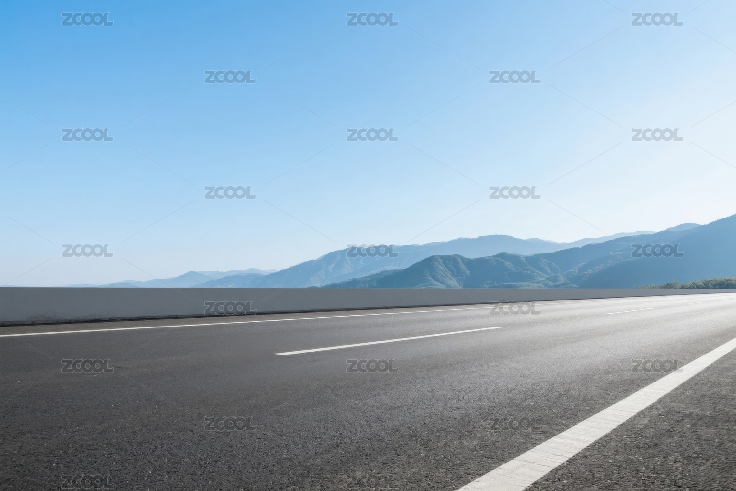 蓝天下无人的沥青路面与远处连绵起伏的山脉