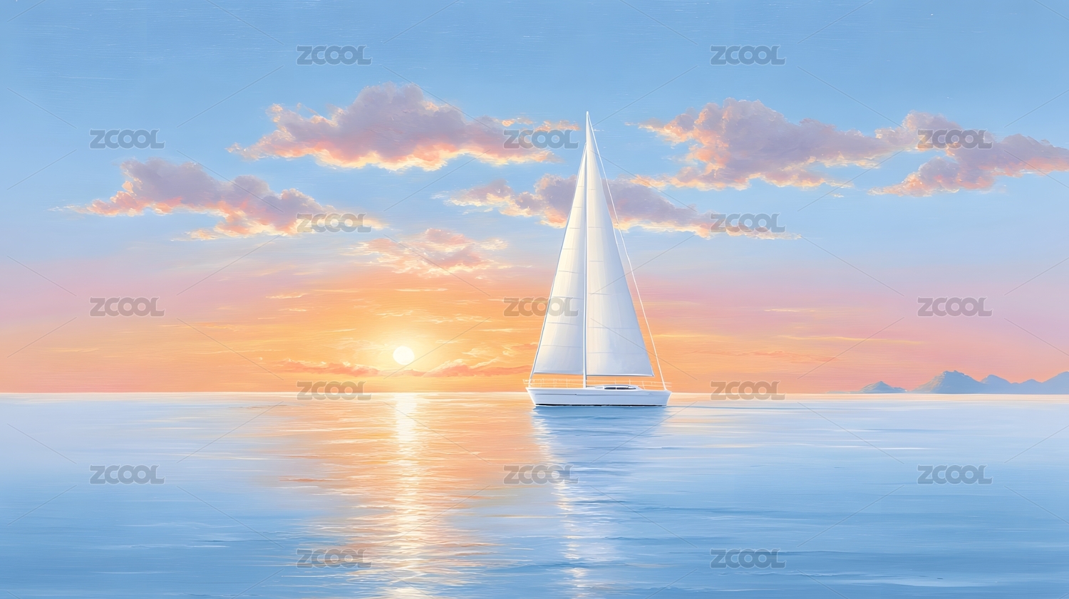 白色,红色,天空,温暖,梦幻,帆船,落日,海面,航行,金黄