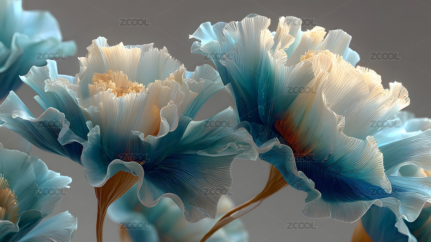 蓝色花朵簇拥白色花朵,绽放唯美抽象