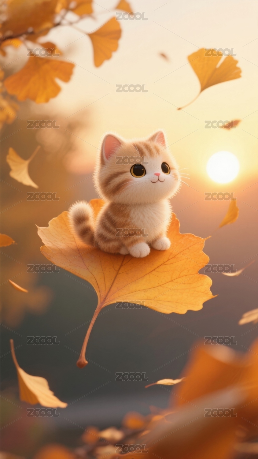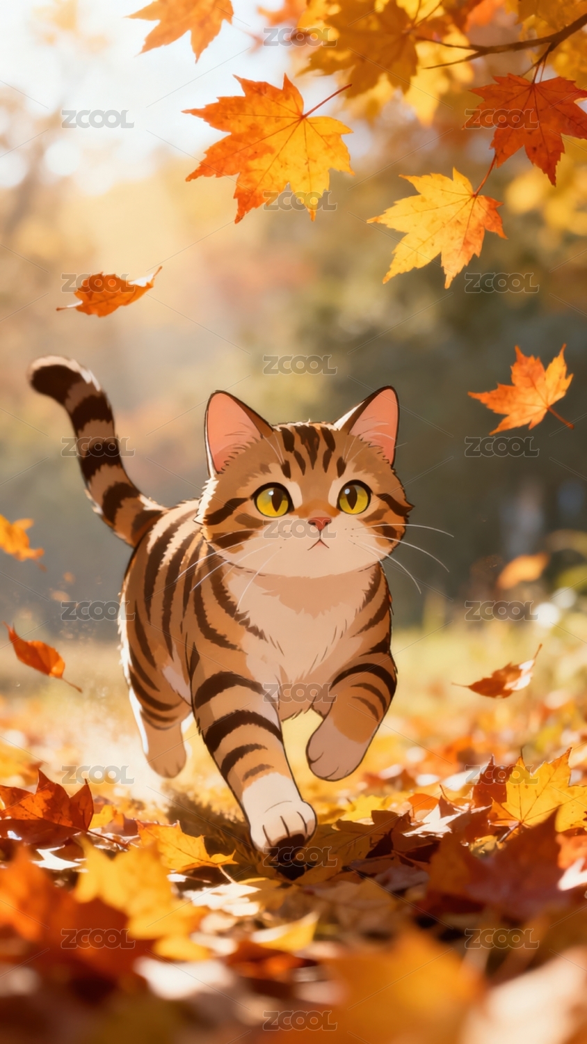 奔跑,尾巴,毛发,落叶,秋天,枫叶,森林,阳光,树木,猫咪