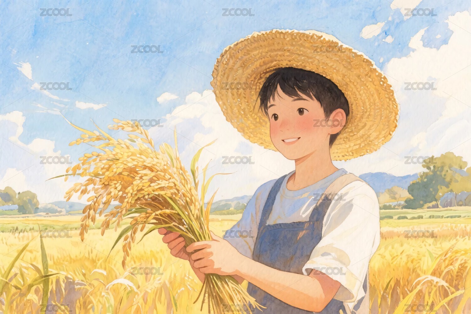 小孩,麦穗,稻田,蓝天,草帽,田园,丰收,农耕,童趣,自然