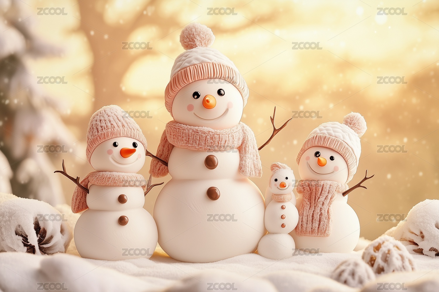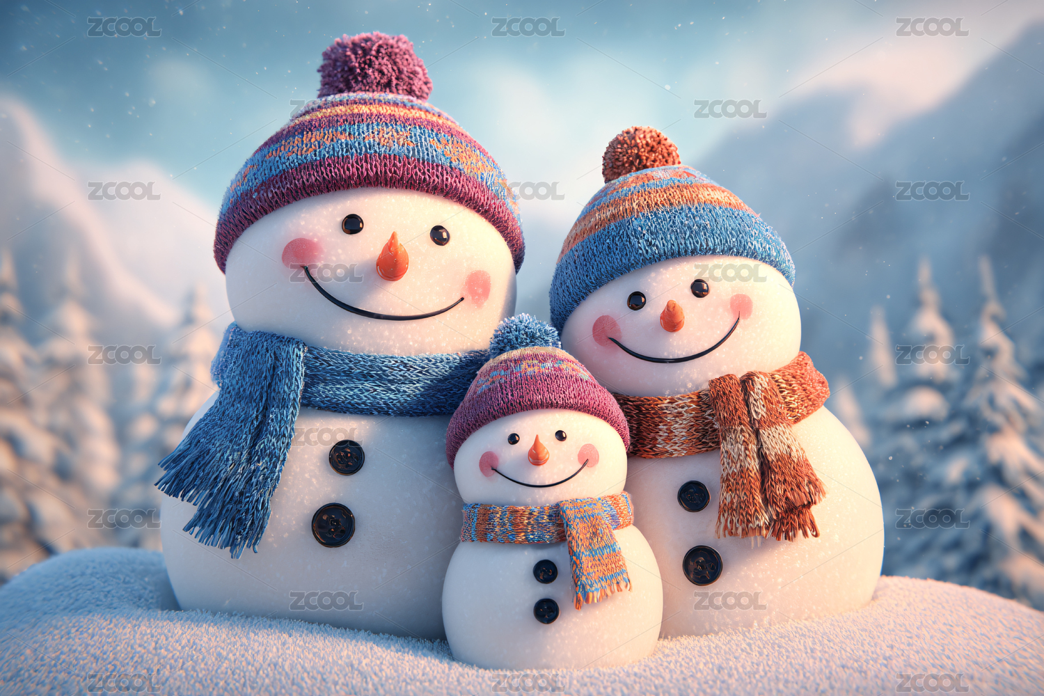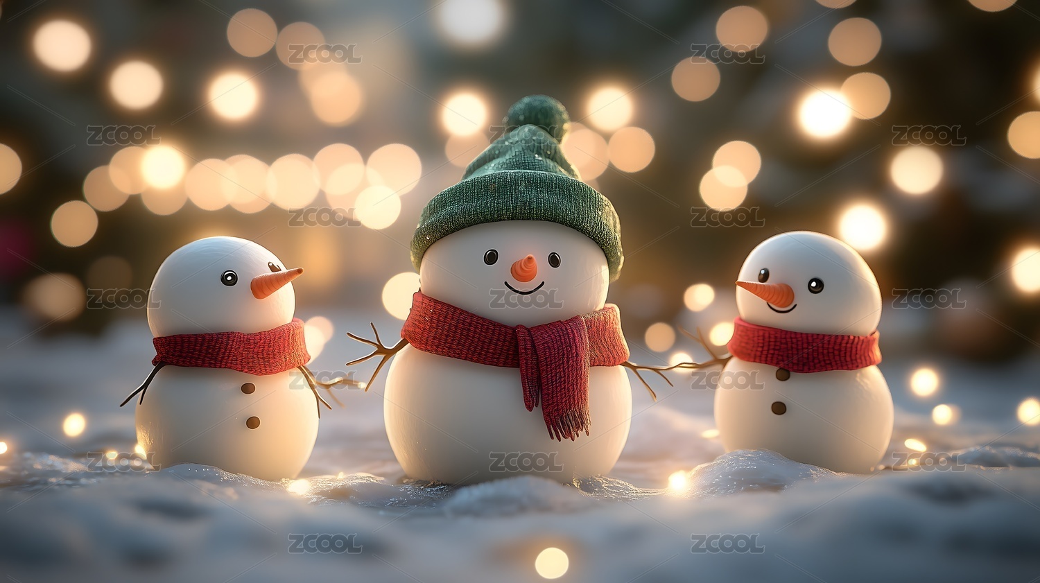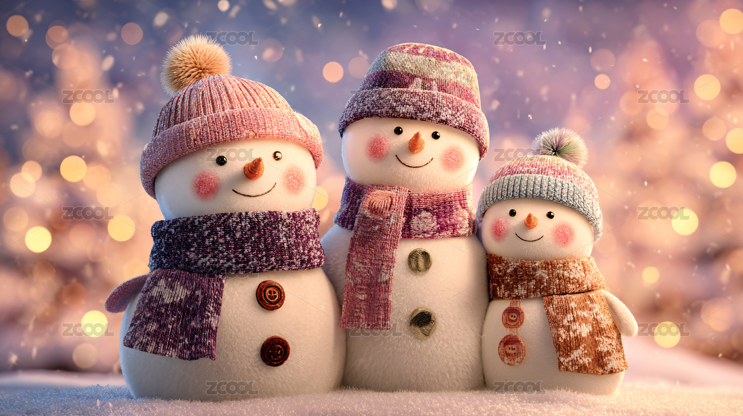雪地里戴帽子的三个雪人