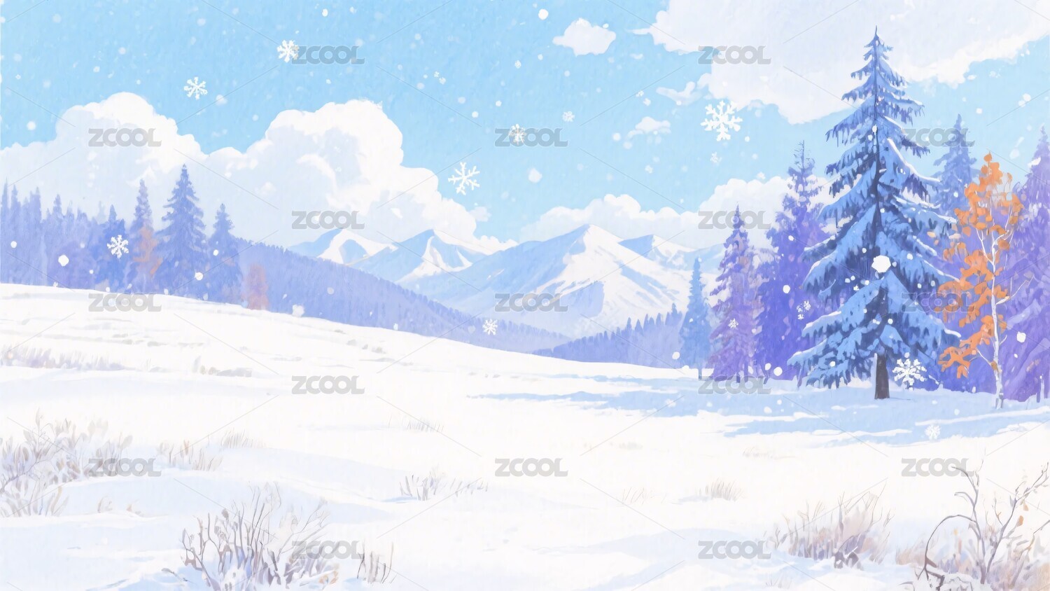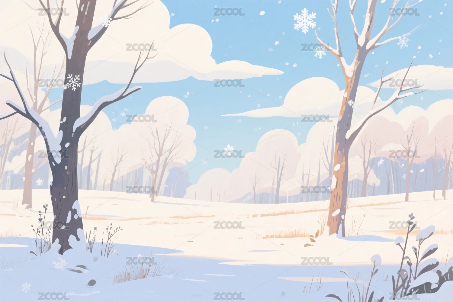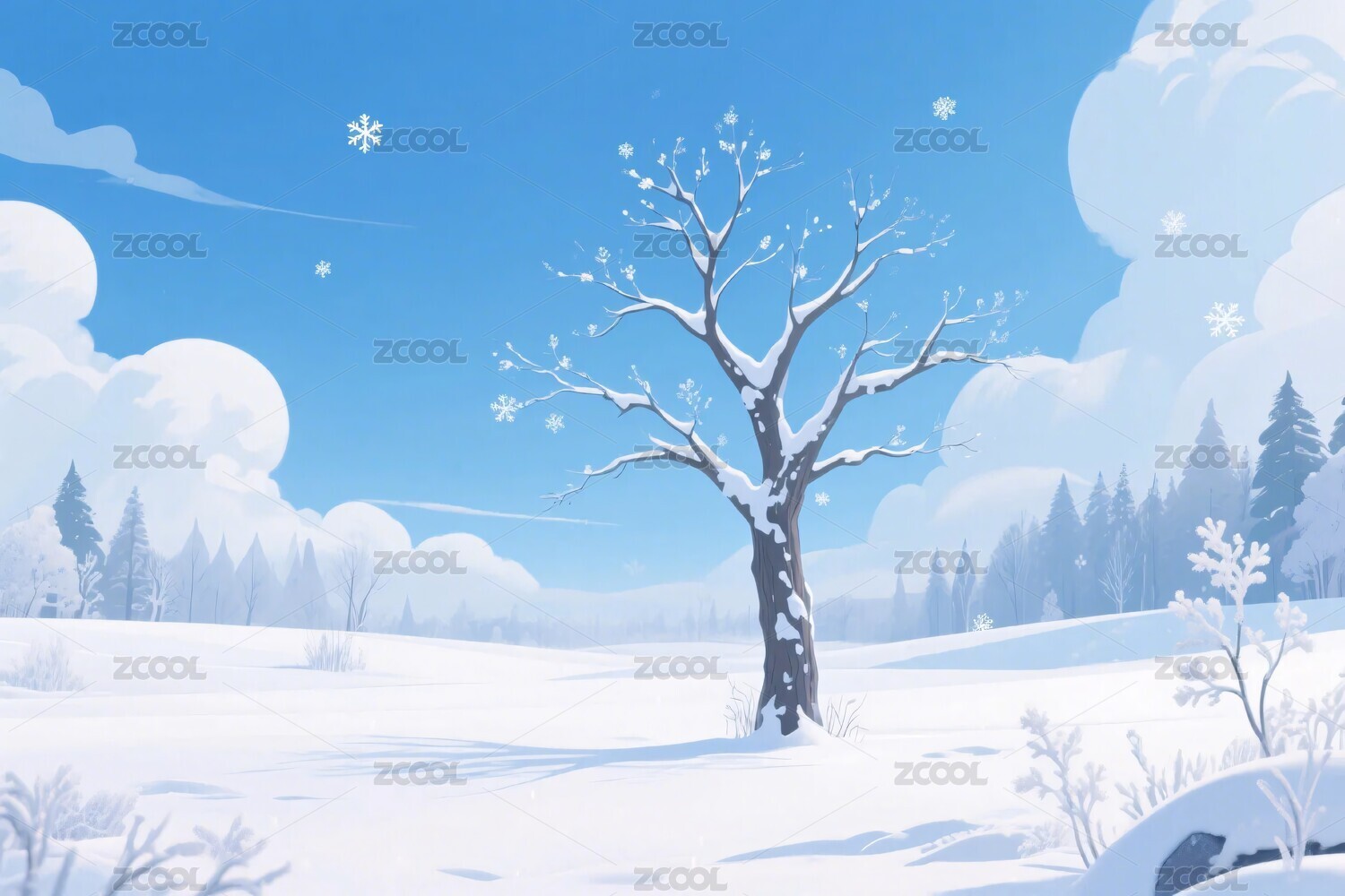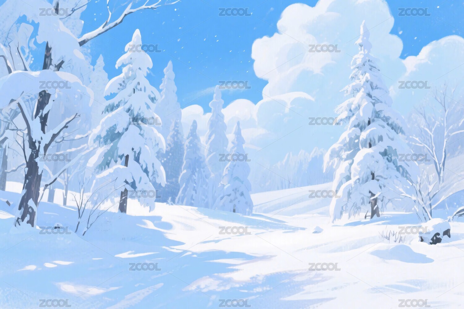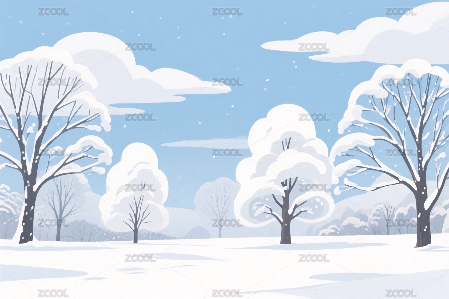 雪景,冬季,雪地,树木,蓝天,云朵,风景,插画,自然,宁静