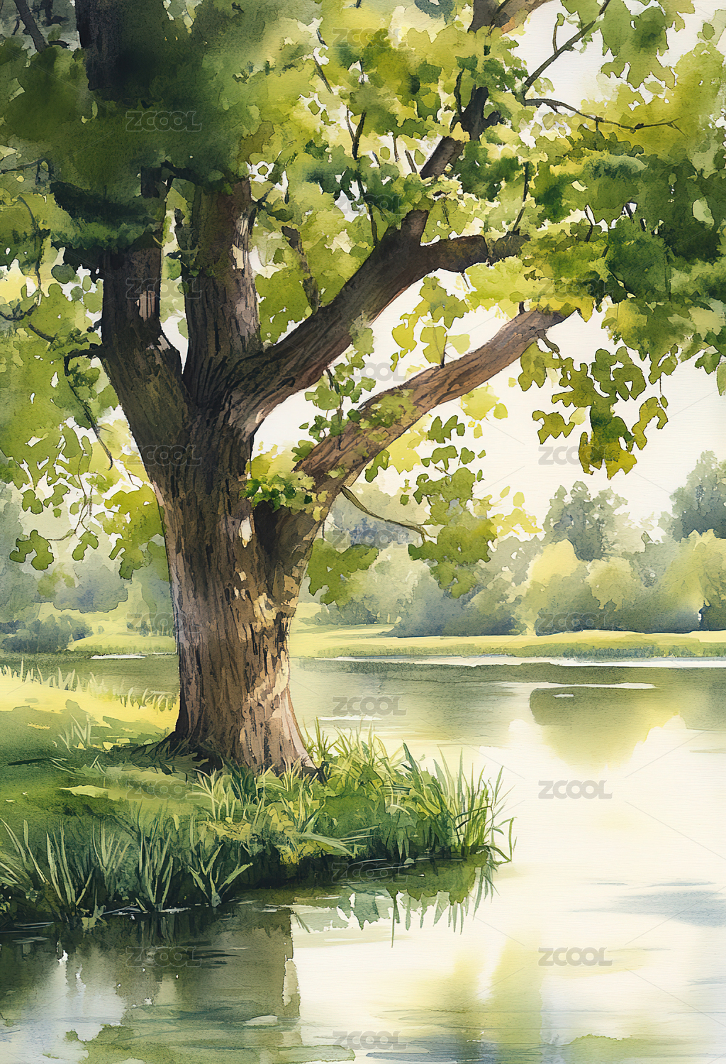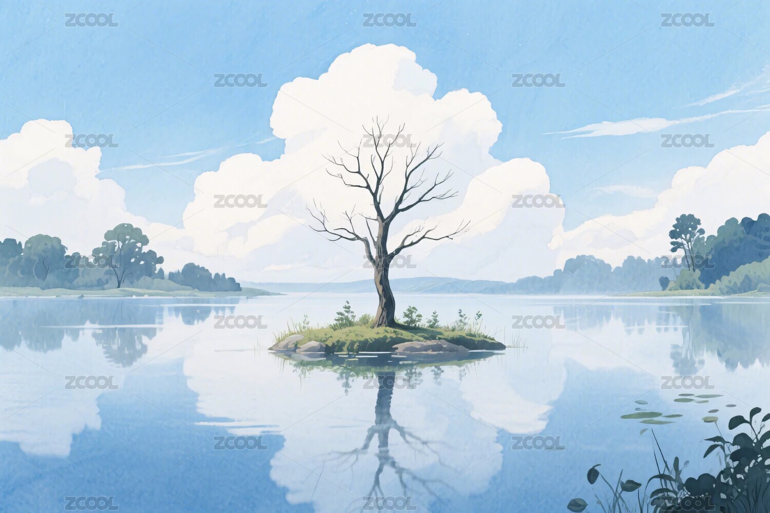 水面,倒影,天空,云朵,草地,风景,插画,水彩,模板,自然