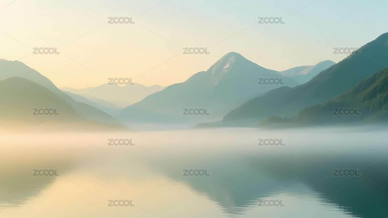 宁静湖泊晨雾山影