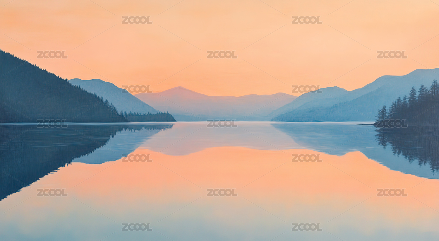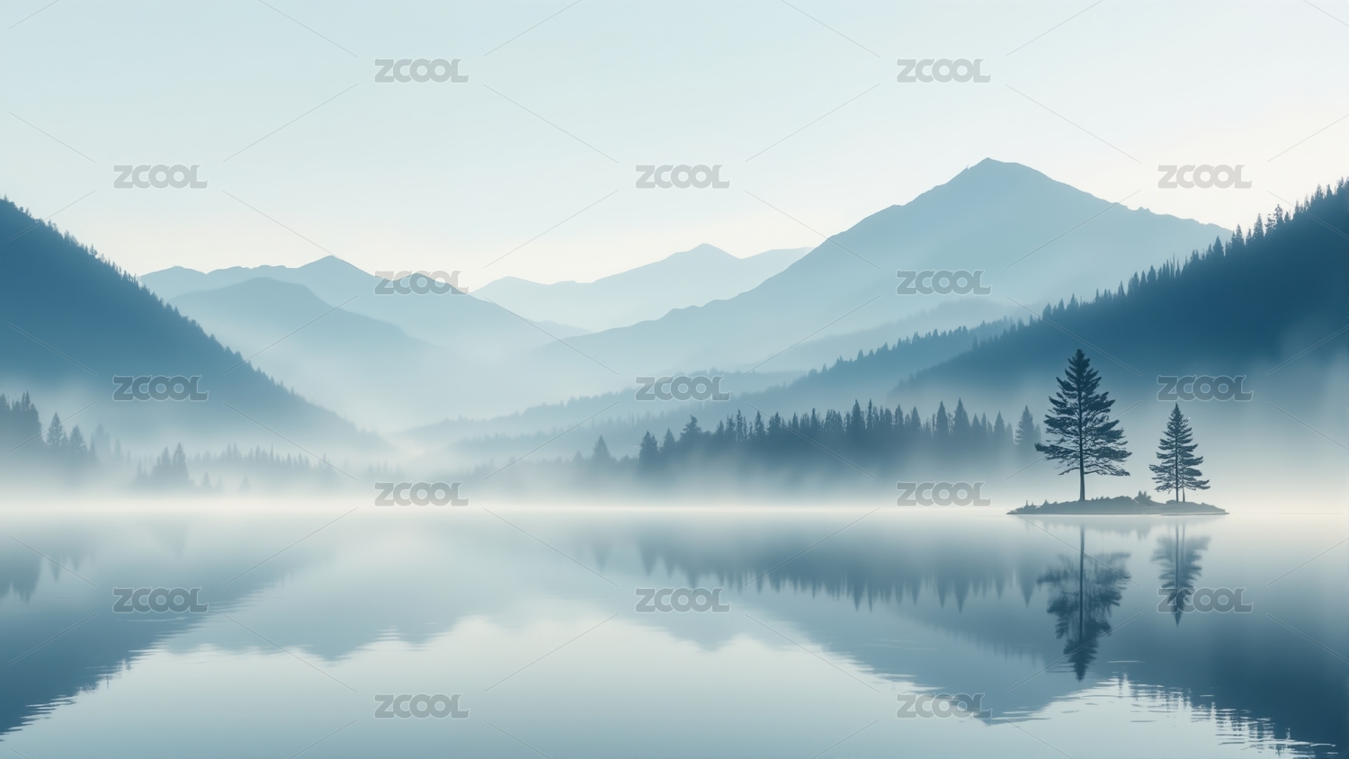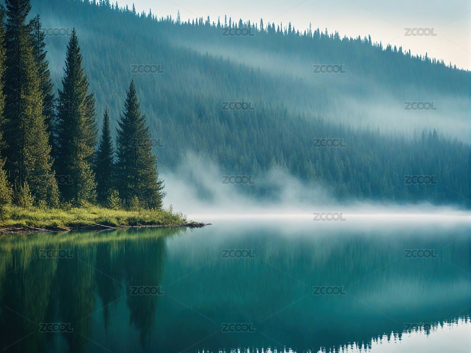 山水,湖泊,森林,雾气,山脉,风景,自然,晨景,宁静,插画