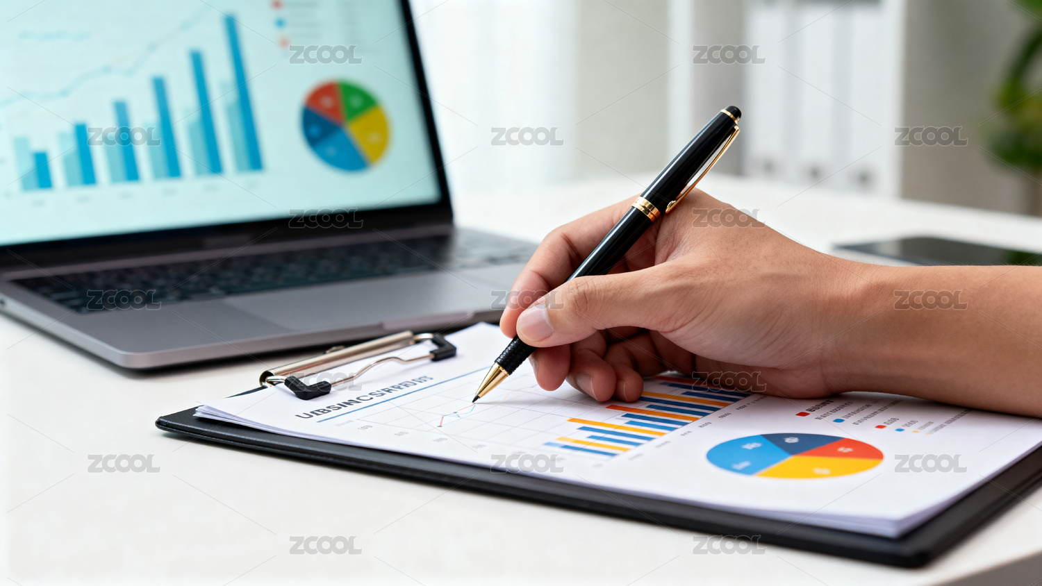 商务金融人士正在办公分析记录计算报表图表年终报告数据概念