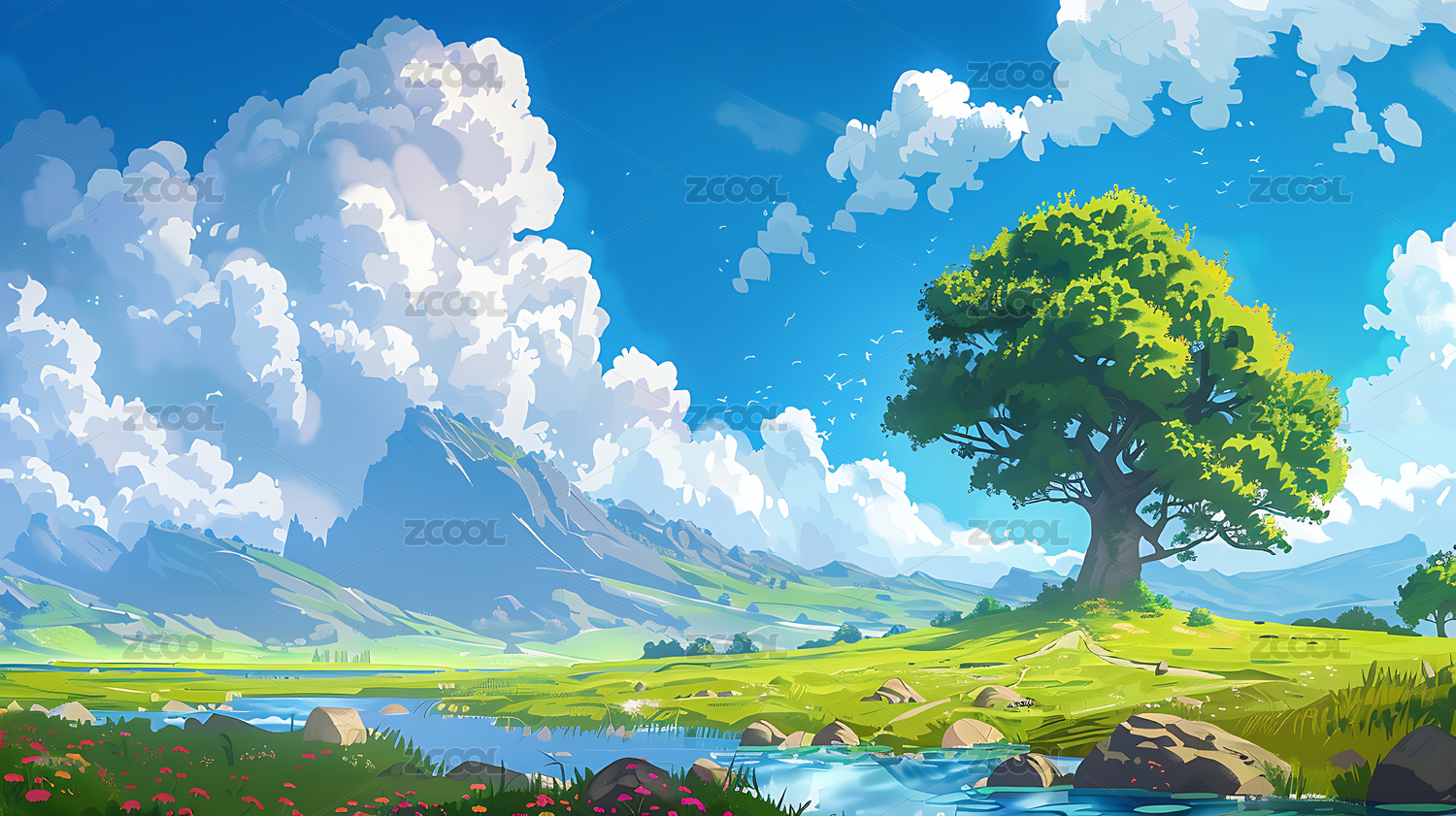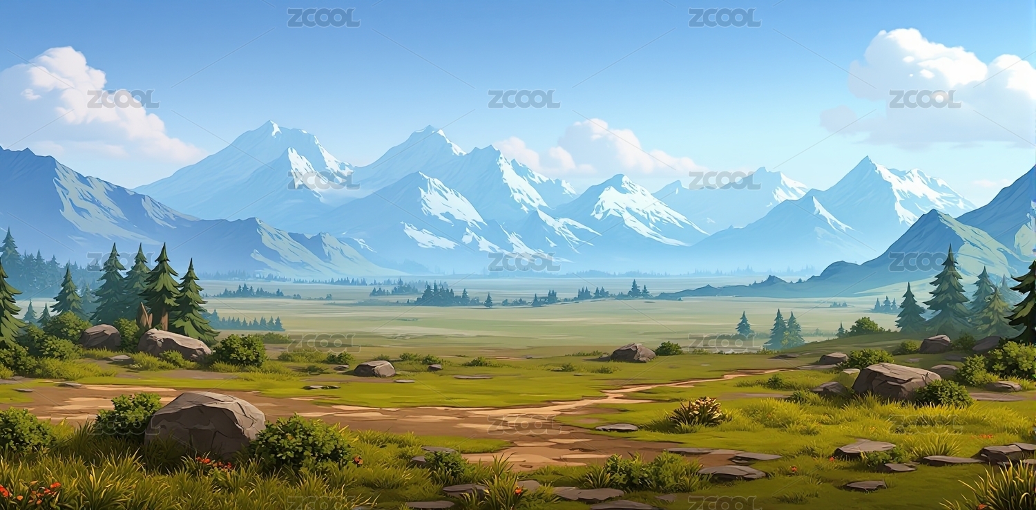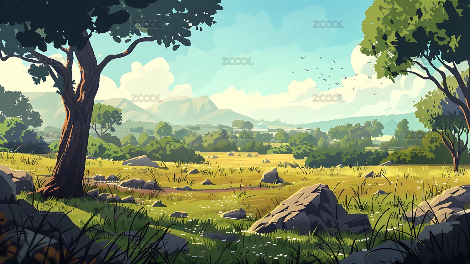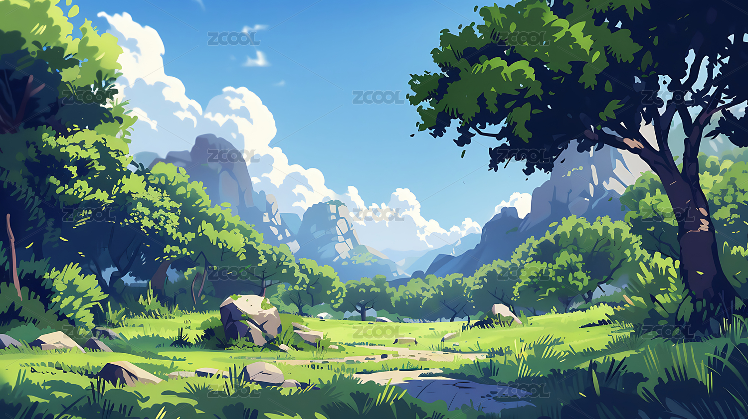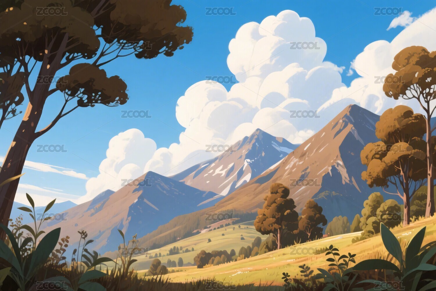 山脉,草原,石头,树木,云朵,天空,自然,风景,插画,背景