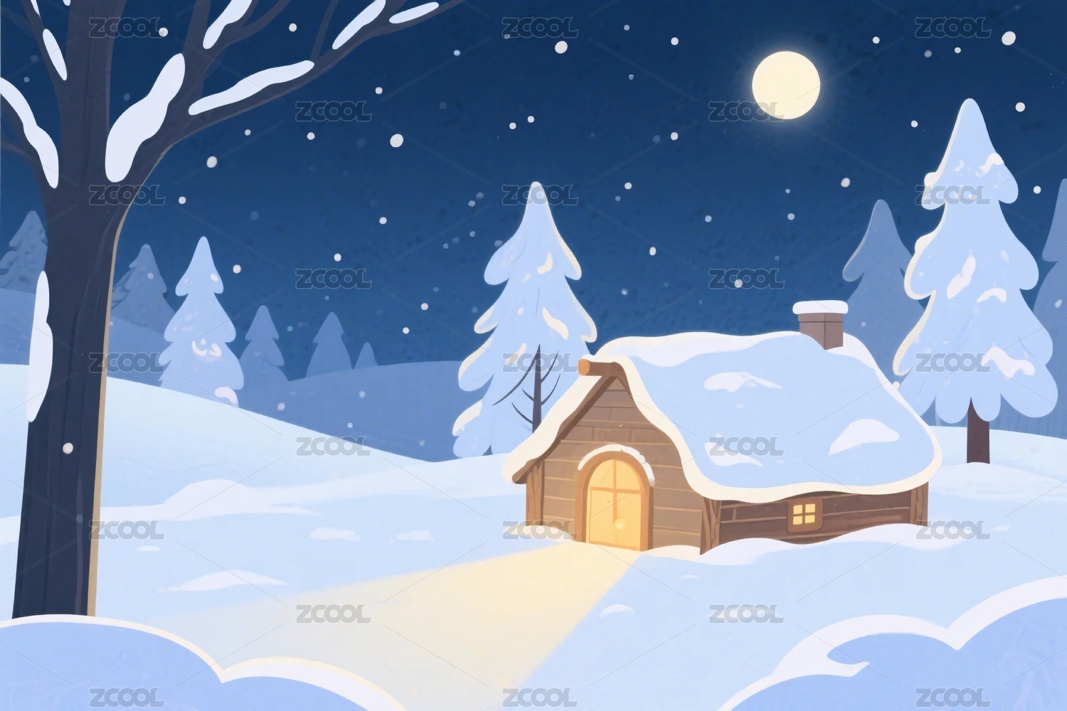 雪夜小屋插画场景