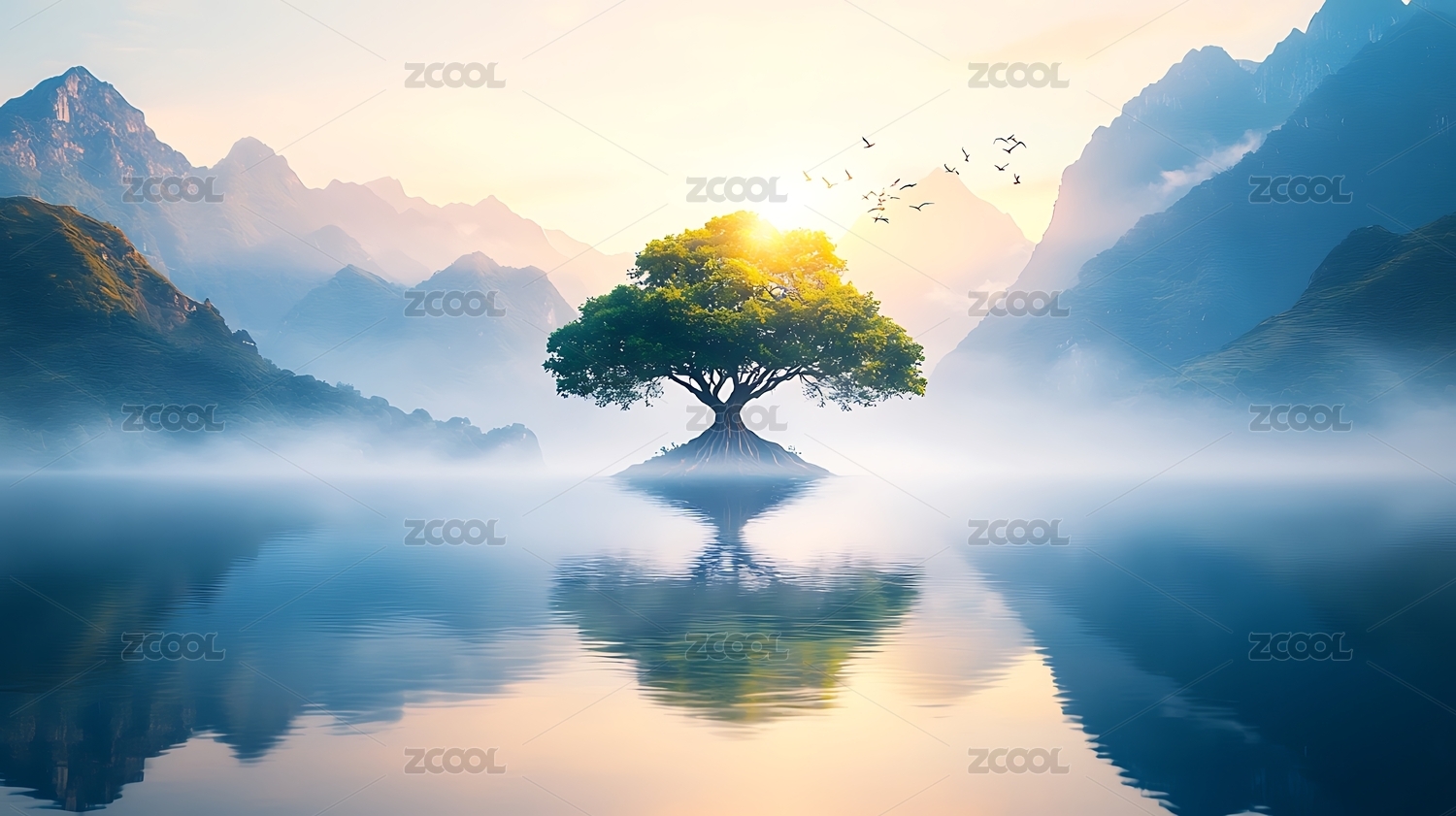 孤树小岛水面倒影
