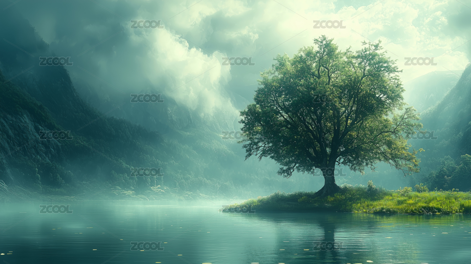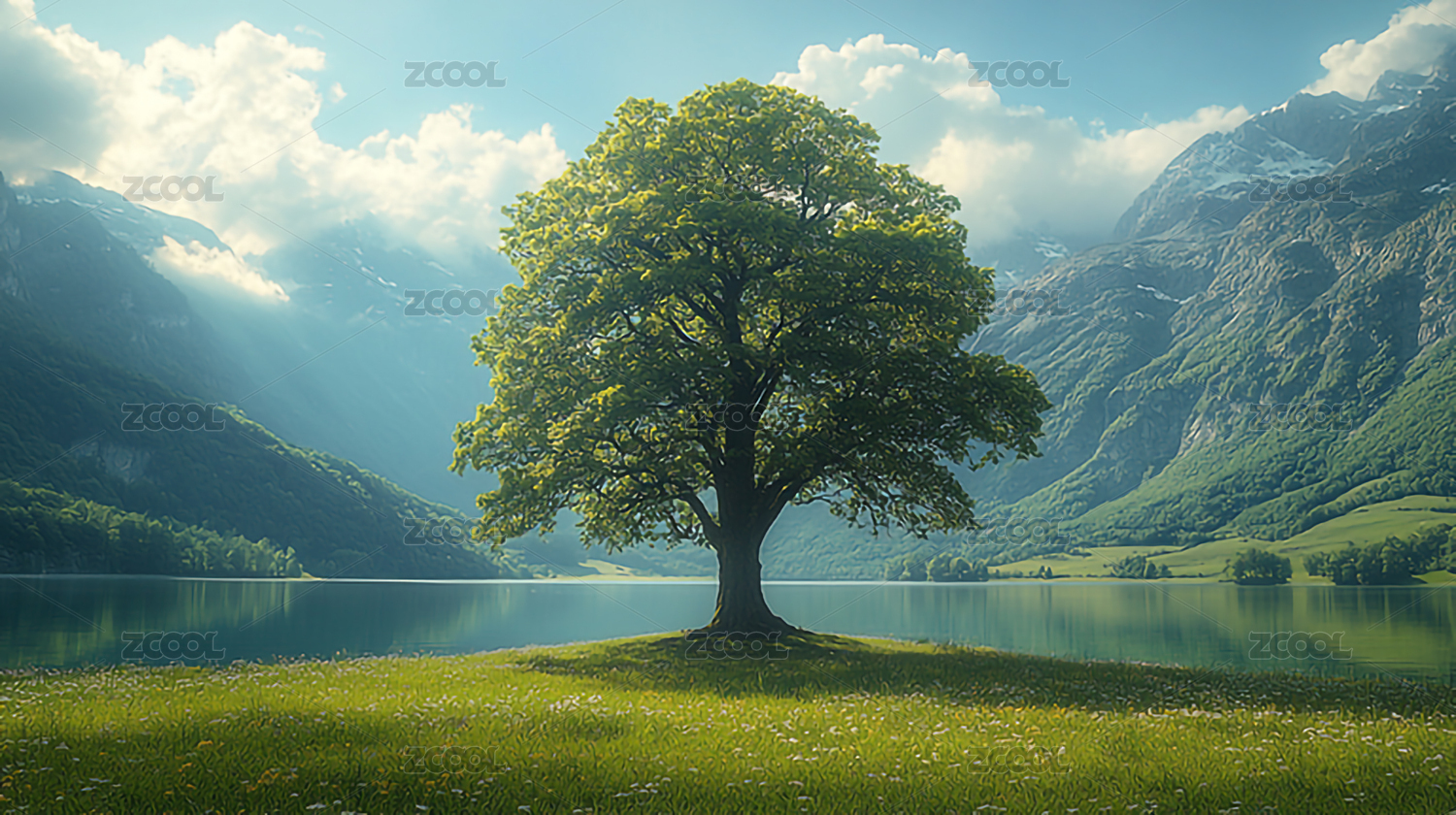 湖畔孤树山水景观