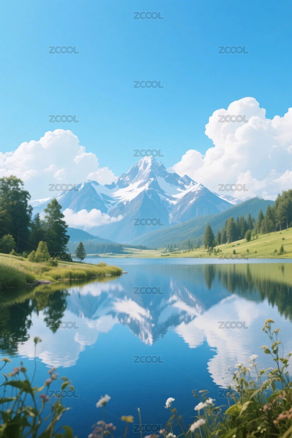 山水,湖泊,青山,蓝天,白云,树木,自然,风景,插画,全景