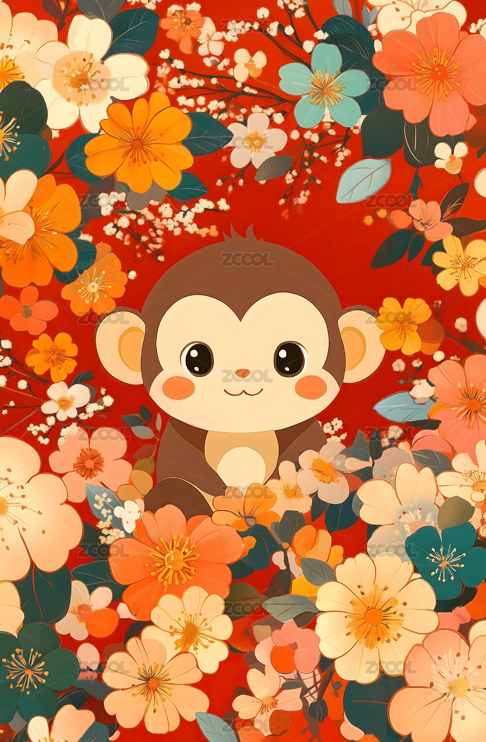 绘本风格花簇中的猴子