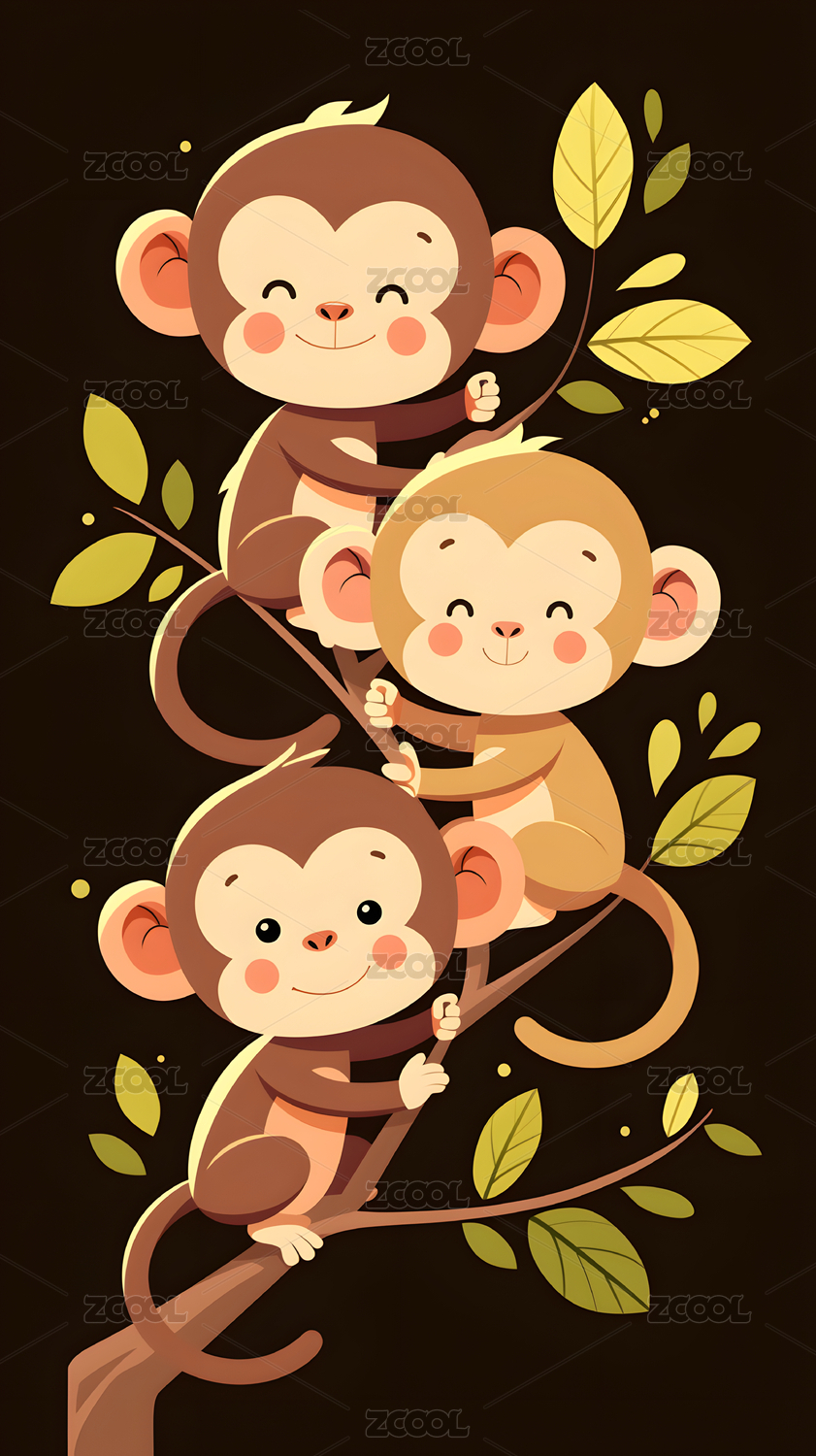 快乐的小猴子和成年猴子卡通绘本插画