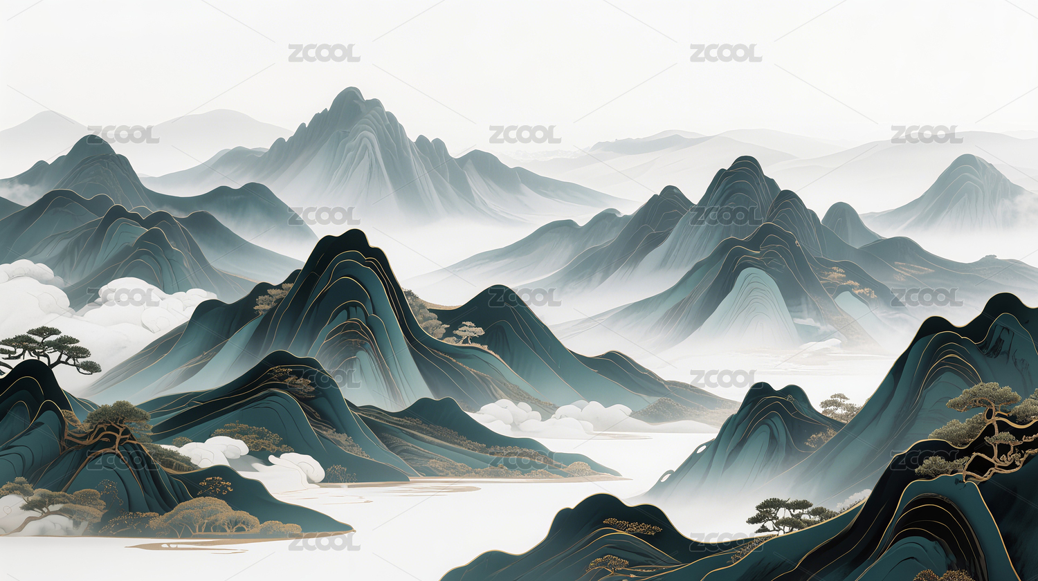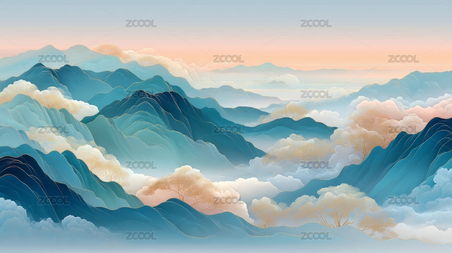 中国传统浅蓝色山水古风国风水墨画背景壁纸