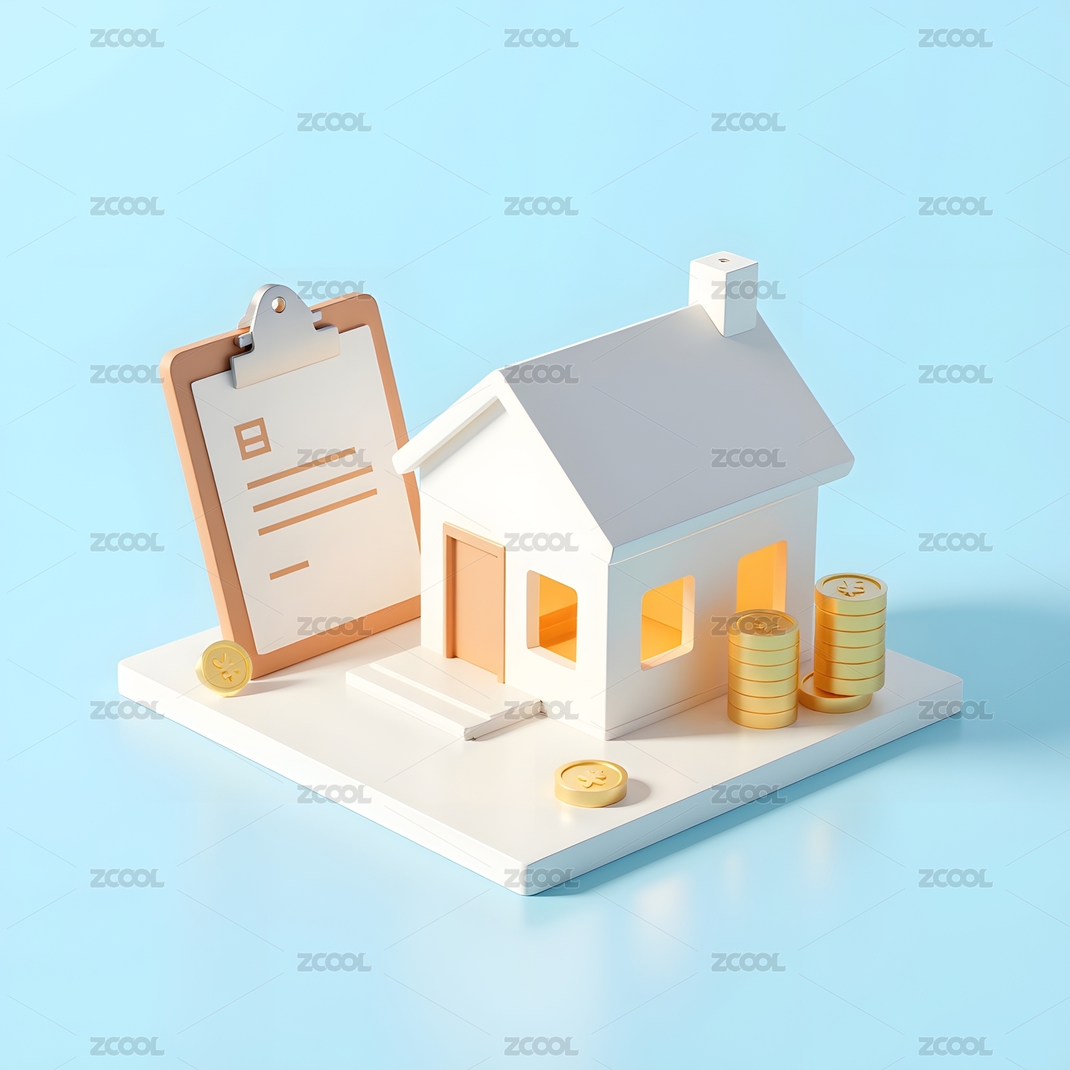 蓝白房屋模型与金币等物品伴随账簿摆放