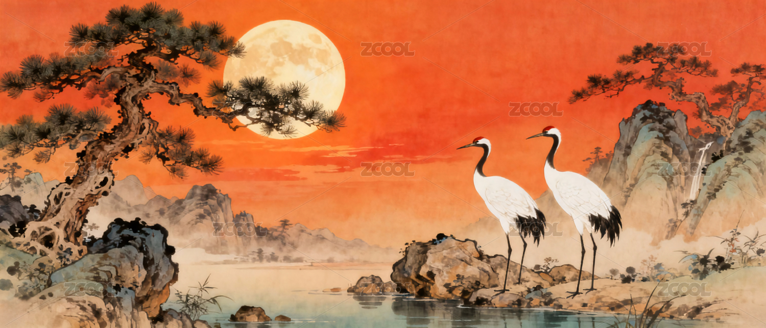月亮,倒影,意境,山峰,自然,风景,溪流,绘画,艺术,传统