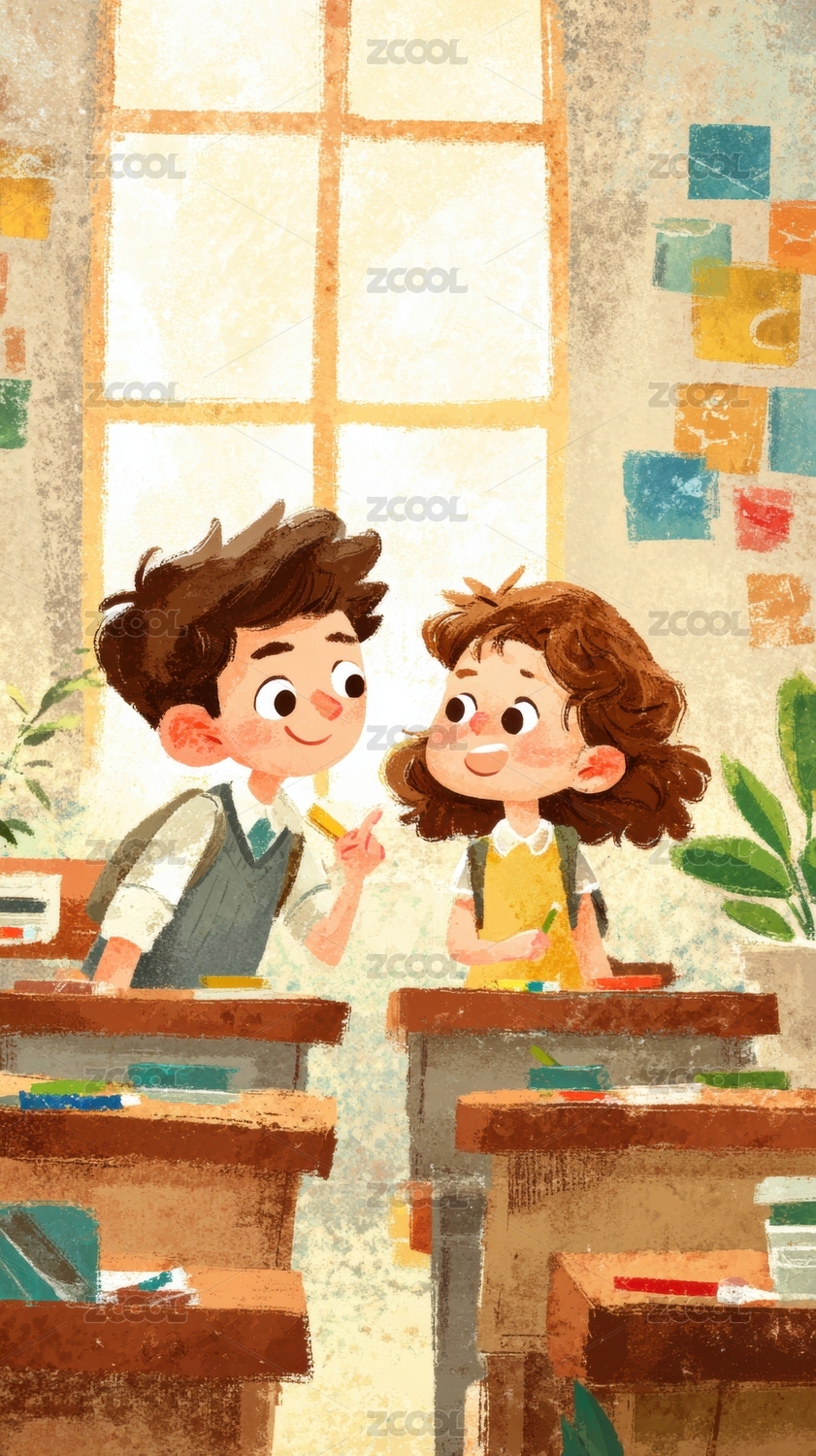 装饰,明亮,男孩,女孩,书包,课桌,窗户,植物,阳光,微笑